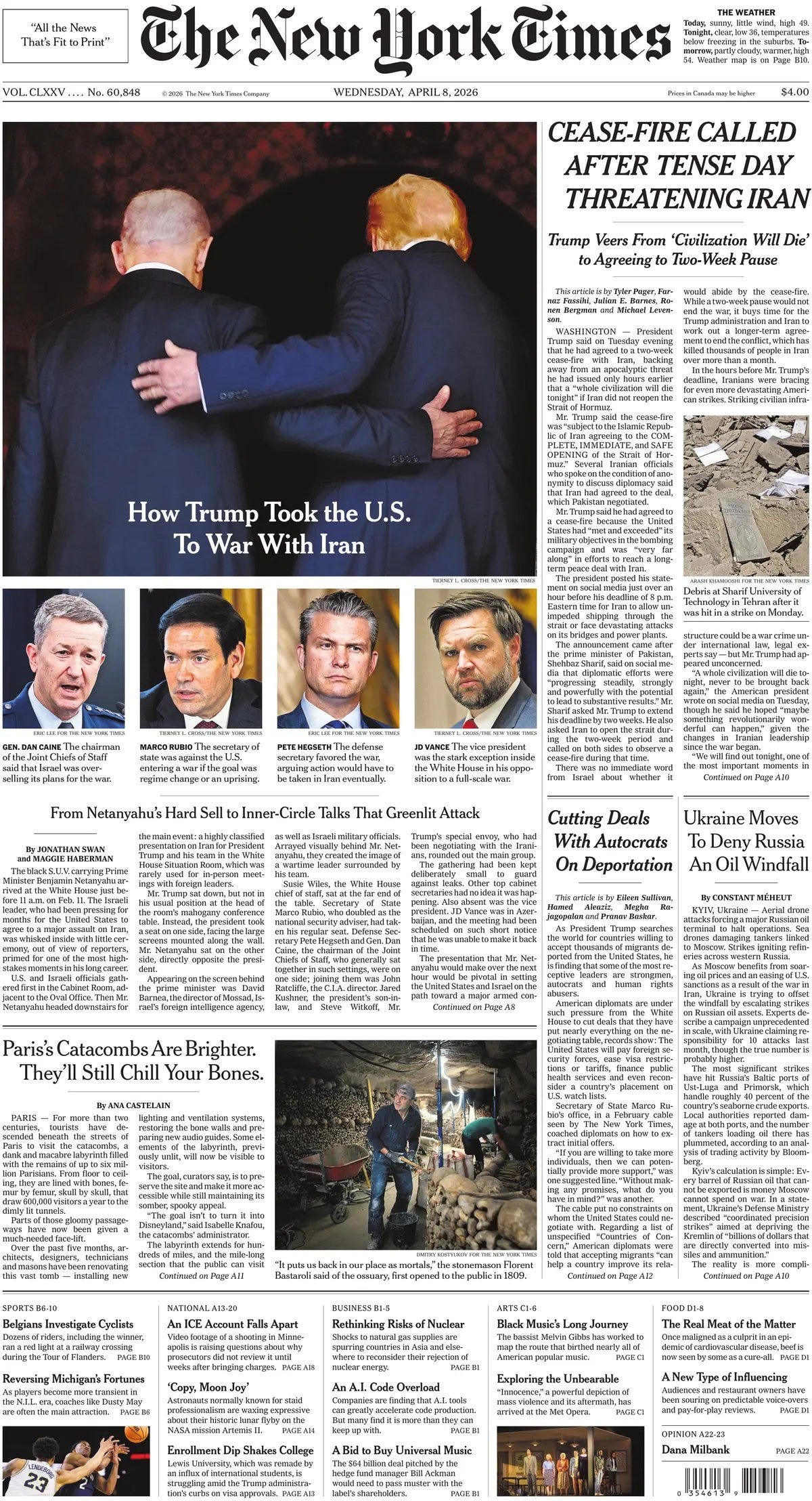 Persian Gulf countries reported dozens of Iranian missile and drone attacks on Wednesday, after a cease-fire was declared between the United States and Iran. Kuwait’s army said in a statement on Wednesday that, since 8 a.m. local time, the country had faced 28 Iranian drone attacks, some of which had targeted “vital oil and power facilities” and caused extensive damage. In the United Arab Emirates, the defense ministry reported 17 ballistic missiles and 35 drone attacks launched by Iran since the beginning of the cease-fire. And the Saudi defense ministry said on Wednesday afternoon that it had intercepted nine drones in recent hours, without naming an attacker. It was unclear why the attacks were continuing, despite the truce and the beginning of what President Trump called “a big day for World Peace.” - NYT