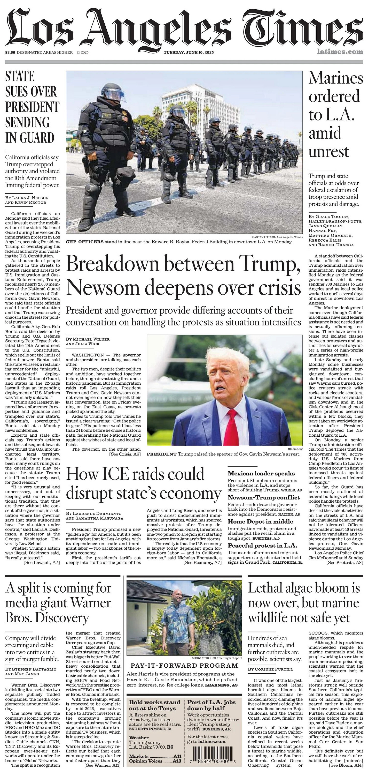 The Pentagon approved the deployment of 700 U.S. Marines from Camp Pendleton to Los Angeles with a mission of helping to protect federal agents and buildings. On Monday evening, a military convey was seen traveling from Twentynine Palms toward Los Angeles. Gov. Gavin Newsom called the deployment a “blatant abuse of power” and said the state would sue to challenge the move. Newsom’s announcement concerning the Marines comes on the heels of a federal lawsuit the state filed Monday morning over the mobilization of the state’s National Guard during the weekend’s immigration protests. President Donald Trump also ordered the mobilization of an additional 2,000 California National Guard troops to L.A. on Monday night. Newsom criticized the action on X, calling it “reckless.” Monday’s protests were calmer than Sunday’s. By midnight, ongoing immigration protests in downtown L.A. and Santa Ana had largely dispersed. Officers used less-lethal munitions and tear gas as they clashed with a few dozen people who remained in downtown Los Angeles. Earlier in the day, a crowd several hundred strong had rallied in front of the federal building - LA Times