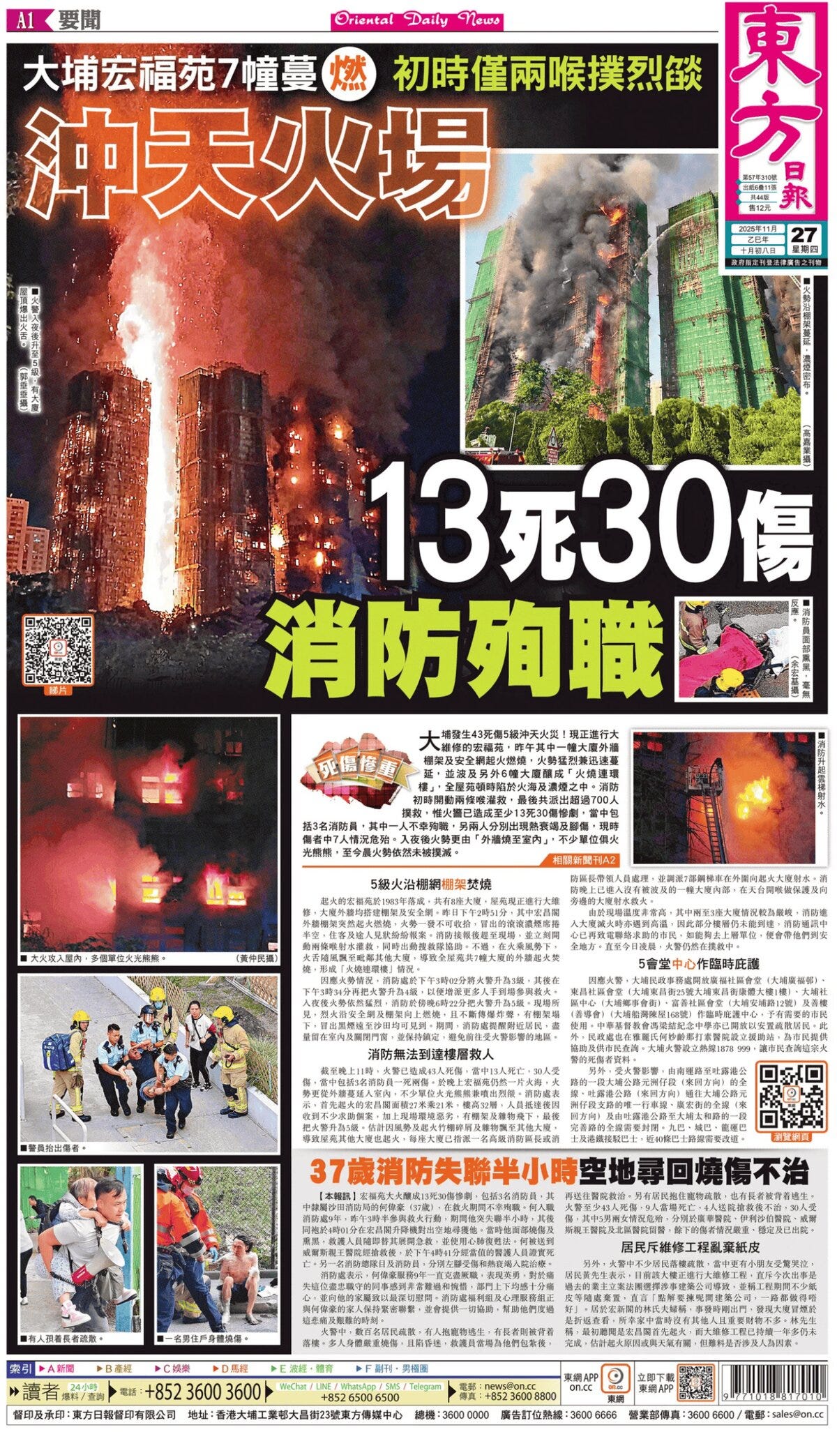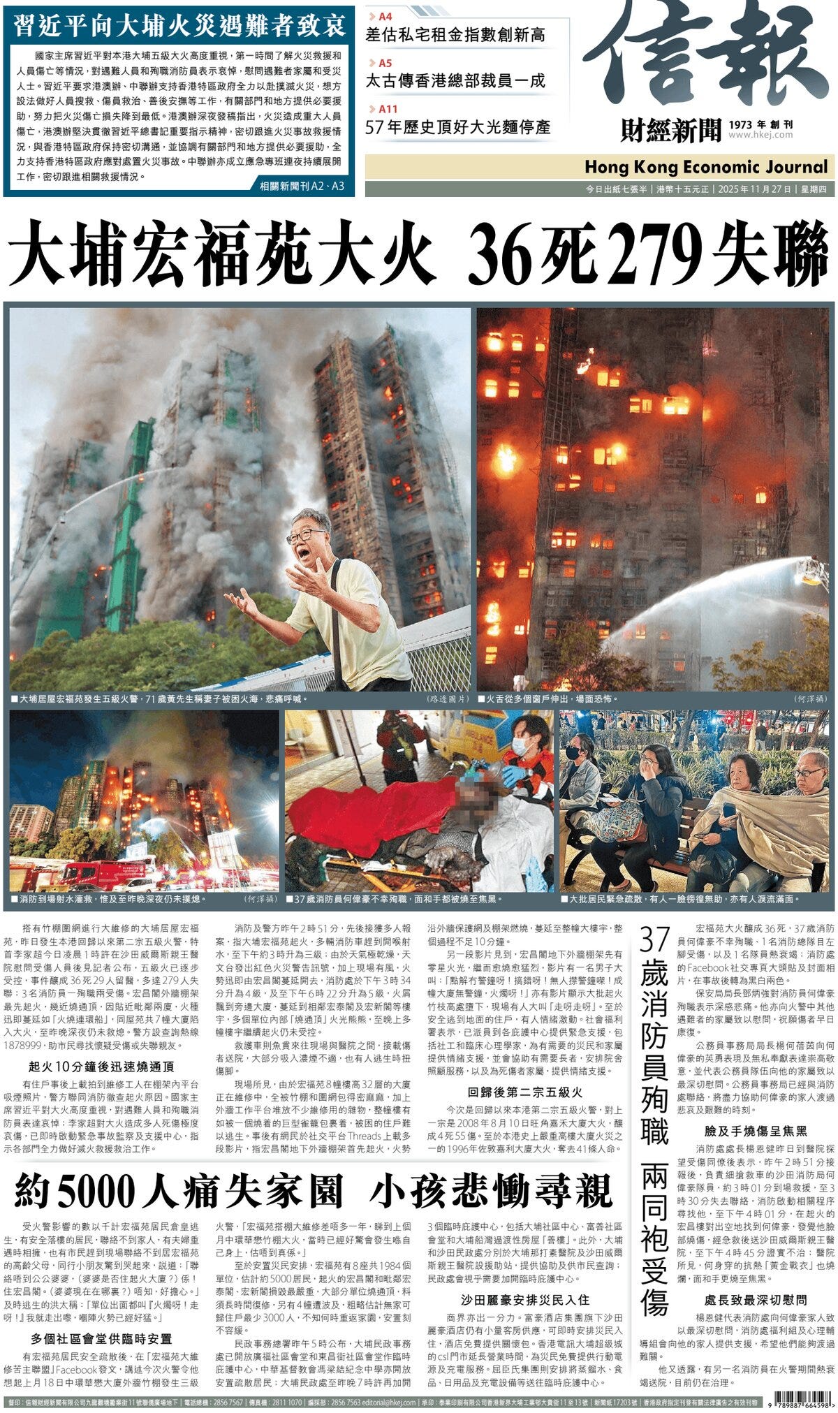Hong Kong leader John Lee Ka-chiu has ordered inspections of all public housing estates undergoing major renovations, with authorities launching a criminal investigation into the city’s deadliest fire in decades that claimed 83 lives at a Tai Po estate. Rescue work continues amid flames now retreating onto the upper floors of three blocks in Wang Fuk Court. Some 56 people remain in hospital. Raging flames in all blocks have been brought under control even as three still have fires on the upper floors of their 31-storey structures. According to a preliminary investigation, officers discovered highly flammable styrofoam cloaking lift windows on every floor, which authorities said caused the fire to spread more rapidly within the blocks and ignite flats through the corridors. The mesh netting and sheeting used outside the buildings also did not meet fire safety standards, officials said on Wednesday night. Three people – two directors and a consultant of the contractor responsible for the renovation of the buildings – have been arrested on suspicion of manslaughter. They allegedly used non-compliant materials in scaffolding nets and sealed windows with styrofoam, which sparked the tragedy as the highly flammable substances caused the fire to spread rapidly. President Xi Jinping expressed his condolences on Wednesday evening and called for “all-out efforts” to minimise casualties and losses. - SCMP