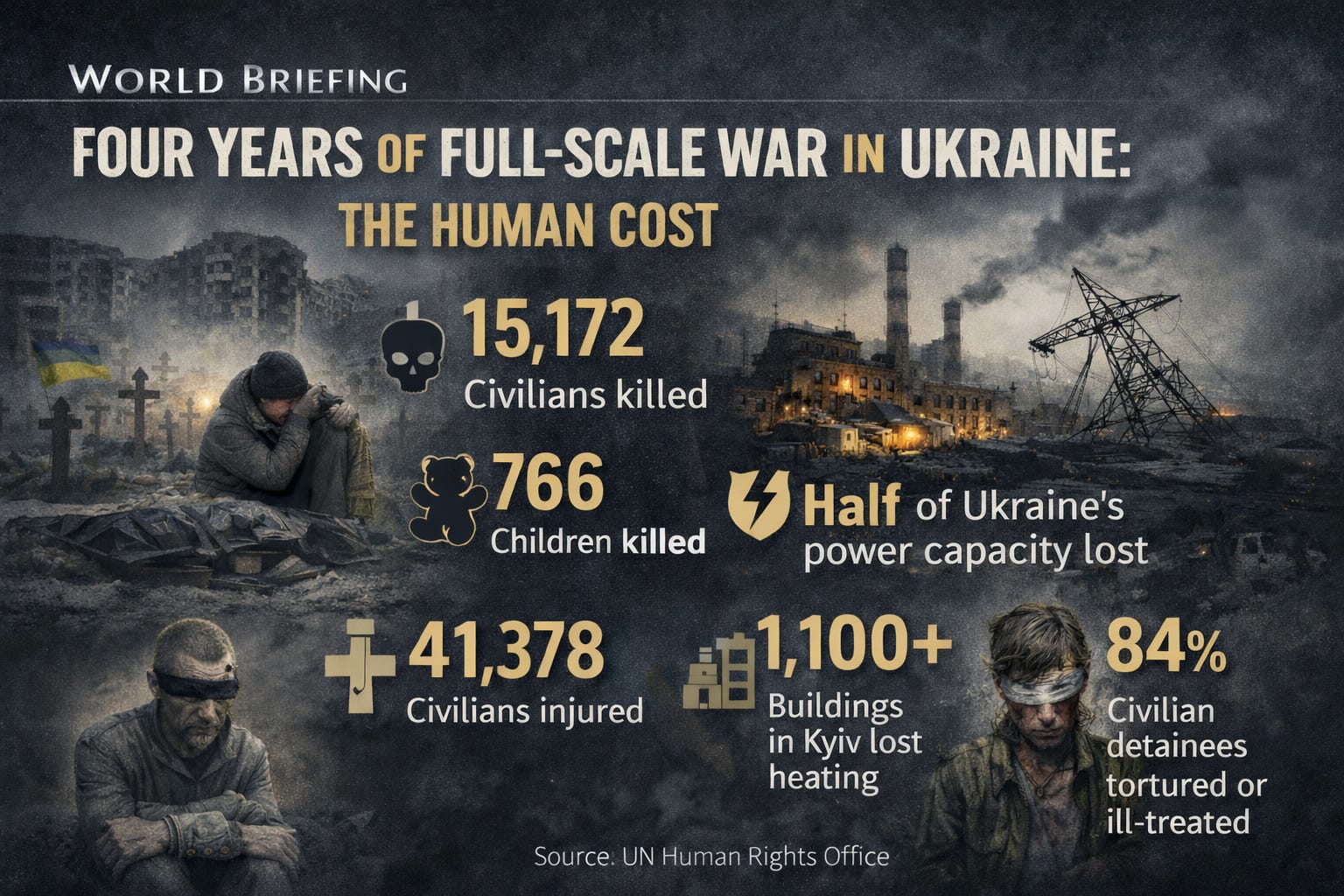 Four years after Russia’s full-scale invasion of Ukraine, the civilian cost is not stabilizing - it is worsening. According to the UN Human Rights Monitoring Mission, at least 15,172 civilians have been killed and 41,378 injured since February 2022, including 766 children killed. Alarmingly, 2025 saw a sharp escalation: civilian casualties rose 31% compared to 2024 and 70% compared to 2023, driven by increased use of long-range missiles and loitering munitions, as well as a surge in short-range drone attacks along the front lines.
