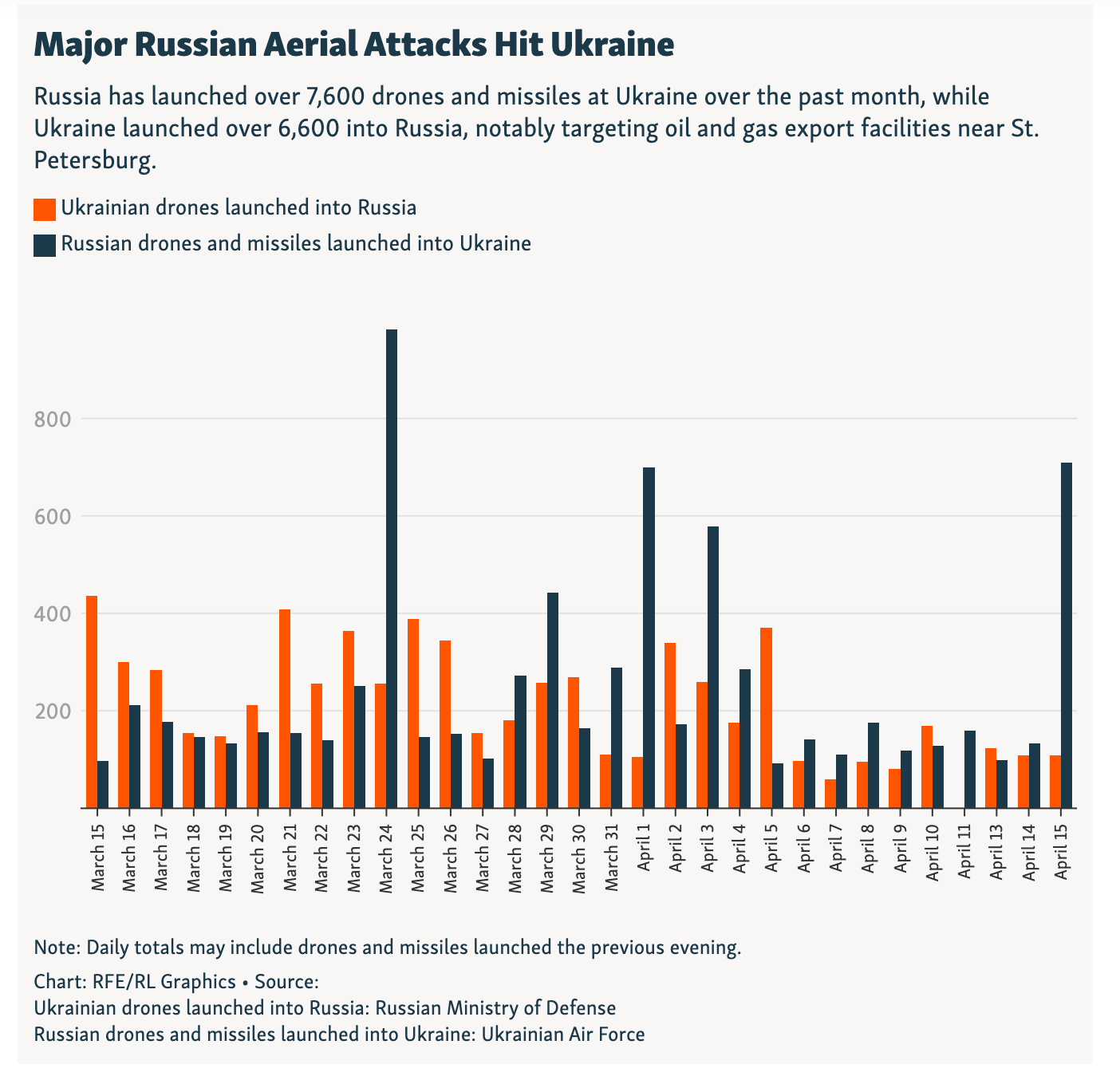Russia launched more than 700 drones and missiles at Ukraine in multiple waves overnight, killing at least 18 people in what local officials said was the deadliest attack in months. Officials said nine people had been killed in the southern port city of Odesa, five in the central city of Dnipro, and four - including a child - in the capital, Kyiv. In Russia, two people - including a child - were killed in a Ukrainian drone attack in the southern Krasnodar region, Moscow said. This comes after a brief ceasefire took place over Orthodox Easter last weekend - though both sides accused one another of hundreds of violations. Russia launched a full-scale invasion of Ukraine in February 2022. In Kyiv, warning sirens jolted people awake at 02:30 local time on Thursday (23:30 GMT on Wednesday), followed soon after by the first explosions. Images posted online by eyewitnesses show bright orange fires and huge plumes of black smoke in central areas of the city. In one video, a drone was filmed slamming straight into the side of an apartment block. Kyiv Mayor Vitali Klitschko wrote on Telegram that a 12-year-old boy was among four people killed. Another 45 people were injured. The mayor added that rescuers had pulled a mother and child from the ruins of a 16-storey residential building that collapsed in the city’s central Podil district. Four emergency medical workers were among those injured in the north of the capital. In Dnipro, regional head Oleksandr Ganzha said four people were killed and dozen had been injured in the Russian attack - before the city’s Mayor Borys Filatov said on Thursday that another body had been found. In the north-eastern city of Kharkiv, a drone strike injured a 77-year-old woman and a 66-year-old man, an official said. Two cities in the south, Mykolaiv and Kherson, have been left without power, according to local officials. Ukraine’s air force said on Thursday morning that Russia had launched 659 drones and 44 cruise and ballistic missiles in the prior 24 hours. It said that 636 drones and 31 missiles had been shot down - but there had been direct hits in 26 locations. Ukrainian President Volodymyr Zelensky warned earlier this week that Ukraine was facing a critical shortage of Patriot air defence missiles, the only means it has of intercepting Russia’s ballistic missiles. Global stocks of the US-made missiles are limited and many have been diverted to the Middle East since the US and Israel began attacking Iran in February. - BBC
