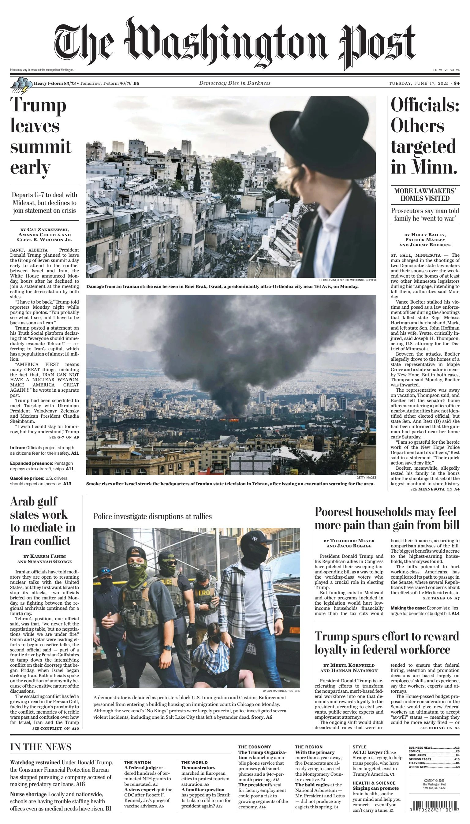 Six of the Group of Seven leaders are trying on the final day of their summit Tuesday to show the wealthy nations’ club still has the clout to shape world events despite the early departure of U.S. President Donald Trump. Canadian Prime Minister Mark Carney and his counterparts from the U.K., France, Germany, Italy and Japan will be joined by Ukrainian President Volodymyr Zelenskyy and NATO chief Mark Rutte to discuss Russia’s relentless war on its neighbor. World leaders had gathered in Canada with the specific goal of helping to defuse a series of pressure points, only to be disrupted by a showdown over Iran’s nuclear program that could escalate in dangerous and uncontrollable ways. Israel launched an aerial bombardment campaign against Iran on Friday, and Iran has hit back with missiles and drones. Trump departed a day early from the summit in the Canadian Rocky Mountain resort of Kananaskis, leaving late Monday and saying: “I have to be back, very important.” As conflict between Israel and Iran intensified, he declared that Tehran should be evacuated “immediately” — while also expressing optimism about a deal to stop the violence. Before leaving, Trump joined the other leaders in issuing a statement saying Iran “can never have a nuclear weapon” and calling for a “de-escalation of hostilities in the Middle East, including a ceasefire in Gaza.” Getting unanimity — even on a short and broadly worded statement — was a modest measure of success for the group. At the summit, Trump warned that Tehran must curb its nuclear program before it’s “too late.” He said Iranian leaders would “like to talk” but they had already had 60 days to reach an agreement on their nuclear ambitions and failed to do so before the Israeli aerial assault began. “They have to make a deal,” he said. Asked what it would take for the U.S. to get involved in the conflict militarily, Trump said Monday morning, “I don’t want to talk about that.” - AP