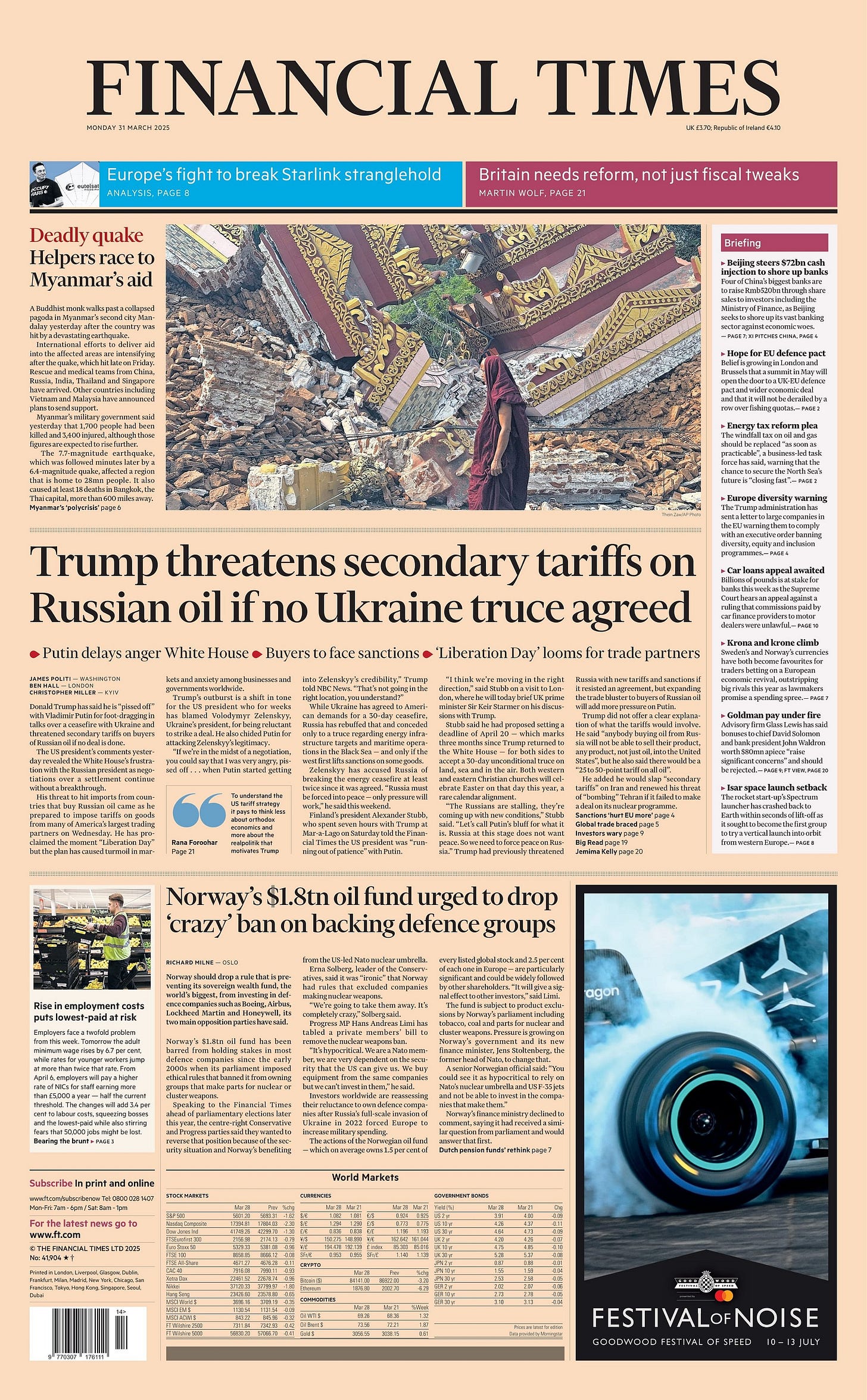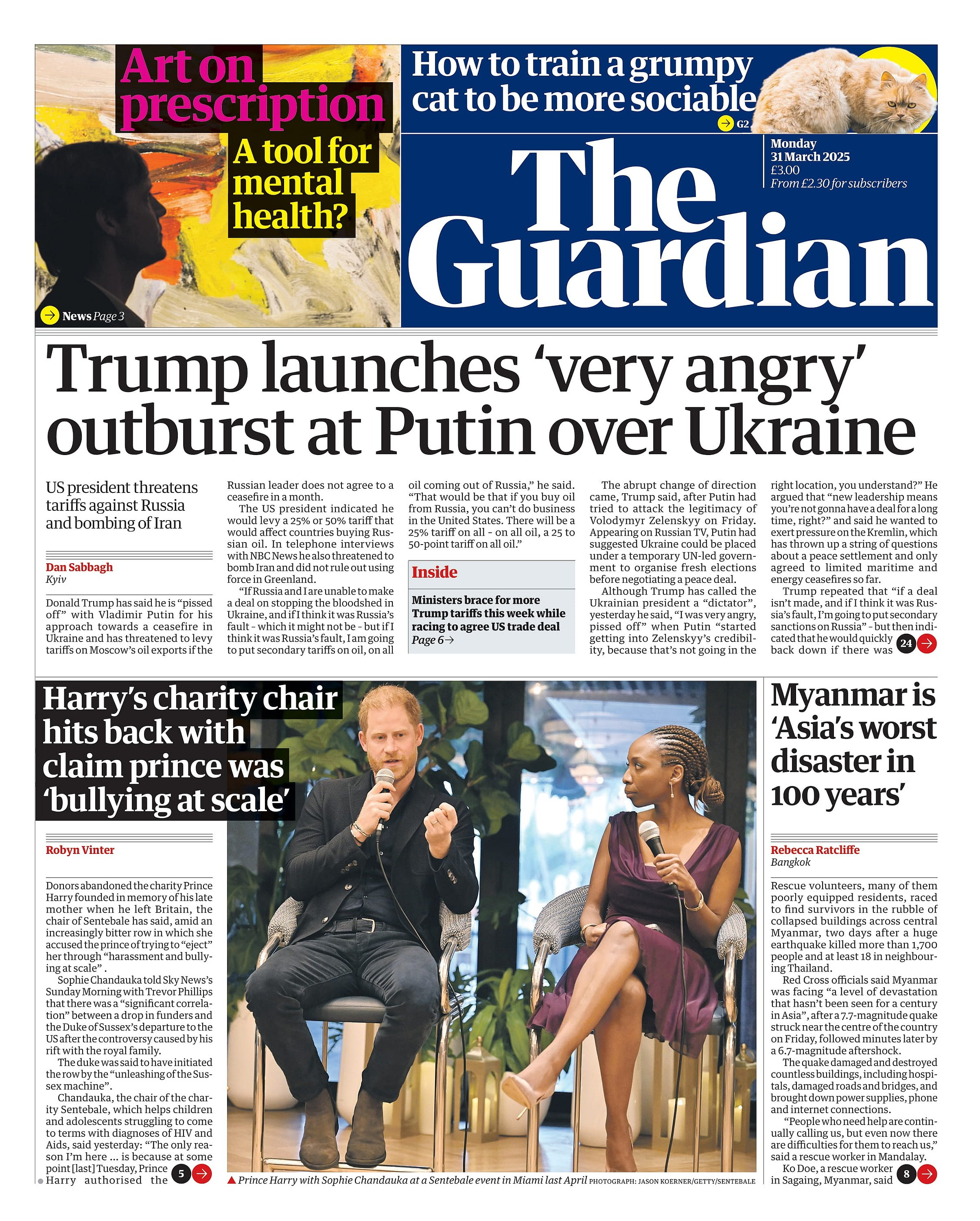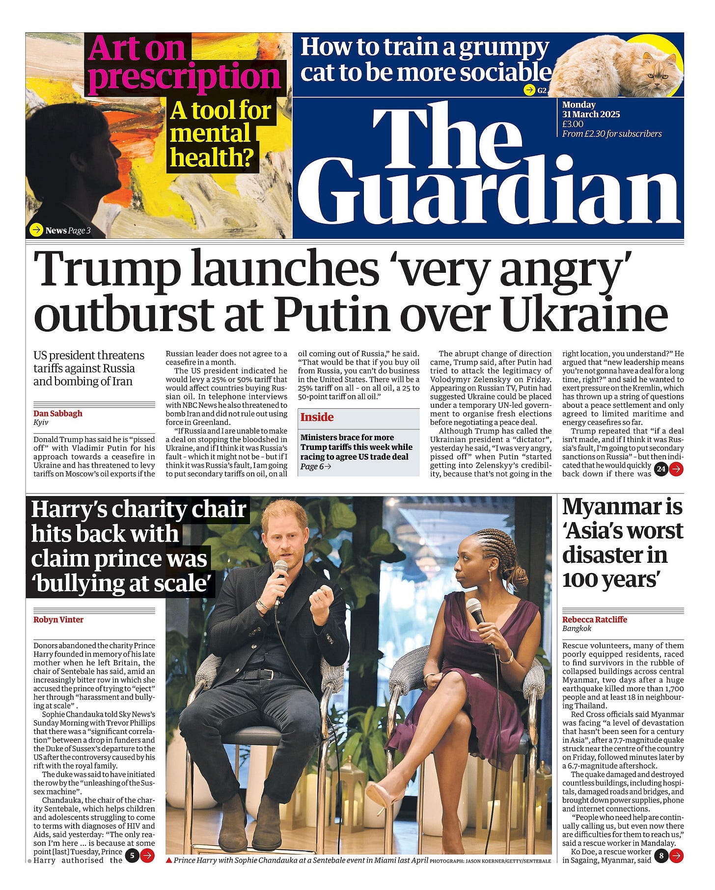 Donald Trump claimed on Sunday that Ukraine’s president, Volodymyr Zelenskyy, was “trying to back out of the rare earth deal and if he does that he’s got some problems, big, big problems”. The Guardian reported that the White House is demanding the first cut of all Ukraine’s mineral resource revenue for years, plus interest, in return for military aid. Zelenskyy has been open to a deal but cautious about the terms, while the Trump administration has been on-again, off-again about getting it signed. Trump also said he is “pissed off” at his Russian counterpart, Vladimir Putin, and has threatened to impose secondary sanctions on Russian oil if Moscow does not agree to a ceasefire to end its war in Ukraine. “If Russia and I are unable to make a deal on stopping the bloodshed in Ukraine, and if I think it was Russian’s fault – which it might not be – but if I think it was Russia’s fault, I am going to put secondary tariffs on all oil coming out of Russia,” Trump said in an interview with NBC on Sunday.
