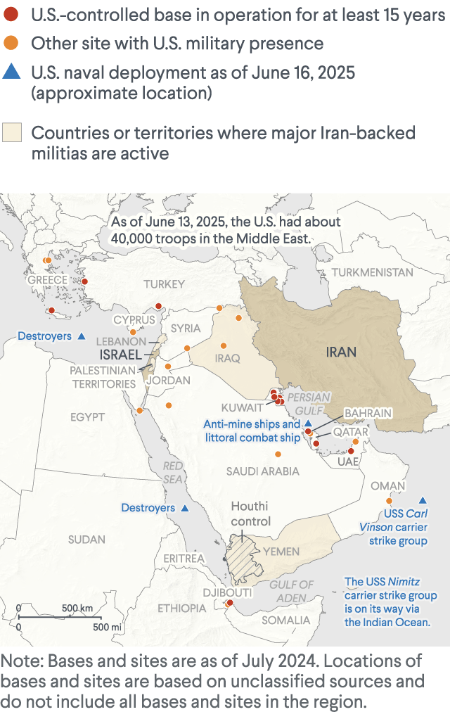 The United States maintains a considerable military presence in the Middle East, with forces in more than a dozen countries and on ships throughout the region’s waters. That presence expanded in 2024 as the United States focused on deterring and defeating threats from Iran and its network of armed affiliates in the region, including Hamas (Gaza Strip), Hezbollah (Lebanon), the Houthis (Yemen), and several Iraq- and Syria-based militant groups - CFR