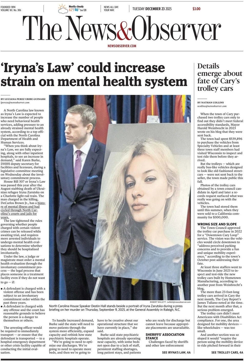 A North Carolina law named after Iryna Zarutska, a Ukrainian refugee who was stabbed to death on a Charlotte light-rail train, is expected to increase the number of people who need behavioural health services in the U.S. state of North Carolina. This is according to an official with its Department of Health and Human Services. “When you think about Iryna’s Law, we are fully expecting, along with other impatient hospitals, to see an increase in demand,” said Karen Burke, a DHHS deputy secretary. House Bill 307 or Iryna’s Law was passed this year after the August stabbing of Zarutsky. The man charged in the killing, DeCarlos Brown Jr., has a history of mental illness and had cycled through North Carolina’s courts and jails for years. The law tightened the rules governing whether people charged with certain violent crimes can be released while awaiting trial, and requires more arrested individuals to undergo mental health screening to determine whether they should be hospitalized involuntarily - The News and Observer