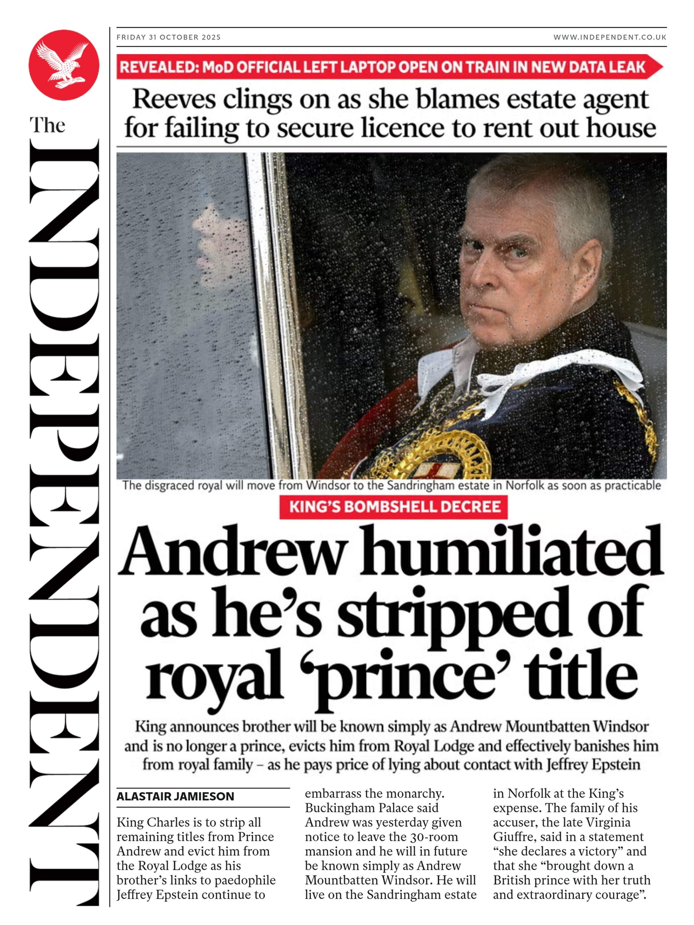The King has decided to strip Andrew of his “prince” title and that he can no longer live in his Royal Lodge home at Windsor. This morning, he has officially lost his Duke of York title - after a “creative” choice by the King. The King’s decision to remove Andrew’s royal titles and oust him from his Windsor home is a “humiliating fall from grace”, a royal correspondent has said. The Telegraph’s India McTaggart told Sky News that the word “unprecedented” is often overused in royal reporting - but it’s “absolutely warranted” in this case. “The King stripping Andrew of all his remaining titles was his nuclear button, and I think that the Palace left no room for misunderstanding in its statement released yesterday,” she said. Explaining why the King came to his decision, McTaggart said it was the “sheer amount of potentially compromising material”. She also explained why Andrew will suffer particularly after the King’s decision. “There are few living royals who put as much store by status and title as he did so, yes [it will sting],” she said. “He really sort of used it as a currency with the friends that he gathered and the various roles that he held, so this will hurt.” As well as losing his royal titles, Andrew has been ordered to leave Royal Lodge - a 30-room mansion that has been his home for more than 20 years. The sprawling property is located in Windsor Great Park, and was granted to Andrew by the late Queen. It sits on an estate of 99 acres and has a swimming pool, an aviary, six lodge cottages, a gardener’s cottage and accommodation for police protecting the royals to stay in. Andrew will now be moving to a property on the Sandringham Estate. Situated in Norfolk, the estate is around 100 miles north of London and is privately owned by the King - Sky News