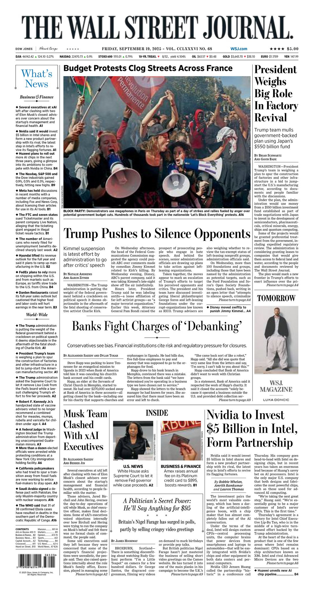 America’s late-night talk show hosts rallied Thursday to support Jimmy Kimmel after his suspension — and accused President Donald Trump of sliding into authoritarianism. TV network ABC yanked Kimmel off air after comments about the killing of conservative activist Charlie Kirk that appeared to associate his alleged assassin with the MAGA movement triggered a backlash from Trump allies. Stephen Colbert — whose own program on CBS was canceled after he criticized the network’s decision to pay Trump millions to settle a lawsuit — used his opening monologue to slam the Trump administration and ABC for “blatant censorship.” “With an autocrat, you cannot give an inch,” Colbert said. “If ABC thinks that this is going to satisfy the regime, they are woefully naive.” Colbert was joined by Jon Stewart, host of Comedy Central’s “The Daily Show,” who mockingly played the role of a grovelling propagandist in a dictatorship. In front of a fake gold backdrop, a jab at Trump’s redesign of the White House, Stewart informed viewers the episode would be “another fun, hilarious, administration-compliant show.” Over at “The Tonight Show” on NBC, Jimmy Fallon called Kimmel “a decent, funny and loving guy” and called for his reinstatement. Fallon reassured viewers he would not be “censored” and launched into a commentary about Trump’s visit this week to the U.K. — before he was quickly drowned out by a satirical voiceover saying the president was “incredibly handsome” and “restoring our national reputation.” Disney-owned ABC announced Wednesday it was indefinitely pausing Kimmel’s late-night talk show, “Jimmy Kimmel Live!,” caving to pressure from Brendan Carr, the Trump-appointed chair of the Federal Communications Commission. Carr had urged ABC and local broadcasters earlier that day “to take action” against Kimmel, calling the comedian’s comments “truly sick” and warning, “We can do this the easy way or the hard way.” - Politico