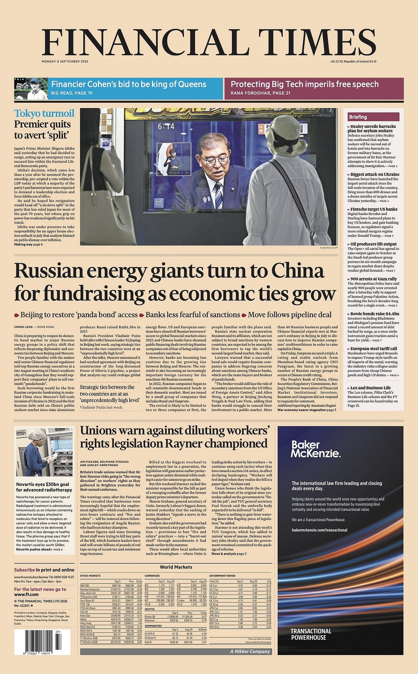 US President Donald Trump threatened Russia with new sanctions after Moscow launched the heaviest aerial assault of the war so far. Sunday’s strikes involved 823 drones and missiles and killed four people, including a mother and baby. Trump has repeatedly talked tough on Russia, but has not always followed through, so European capitals will be watching. “I’ll believe it when I see it,” one diplomat told Politico. The European Union is optimistic, with the bloc’s president saying it had “turned the page” on its rocky relationship with Trump. The US energy secretary is coming to Brussels to discuss new sanctions with EU officials, and the meetings will be a big test of Washington’s commitment to Ukraine, the Financial Times reported.