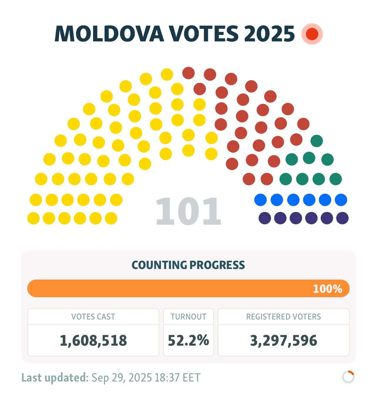 The pro-Europe ruling party of Moldova hailed its major victory over the Russia-friendly opposition in a weekend election, a win that will keep the small, impoverished nation on a European path instead of drifting back toward the Kremlin. According to preliminary results, President Maia Sanduâs Party of Action and Solidarity (PAS) had just over 50 percent of the vote to take 55 of parliamentâs 101 seats. The pro-Russia Patriotic Bloc placed second with 24.6 percent, according to the countryâs election commission, taking 26 seats. Only five parties recorded enough votes to gain seats in the legislature. More than 1.5 million Moldovans cast ballots in the elections amid widespread reports of campaign meddling by the Kremlin, which denied the allegations. âRussia threw everything dirty it had into the fight... Itâs not only PAS that won the elections, the people won,â Igor Grosu, leader of PAS, told reporters on September 29. Sandu is now tasked with nominating a prime minister -- widely expected to be incumbent Dorin Recean -- who can then try to form a new government. Meanwhile, the Kremlinâs online army of disinformation bots has used fake accounts and networks, often AI-generated, to flood social media with pro-Russian narratives and unsubstantiated claims of fraud.