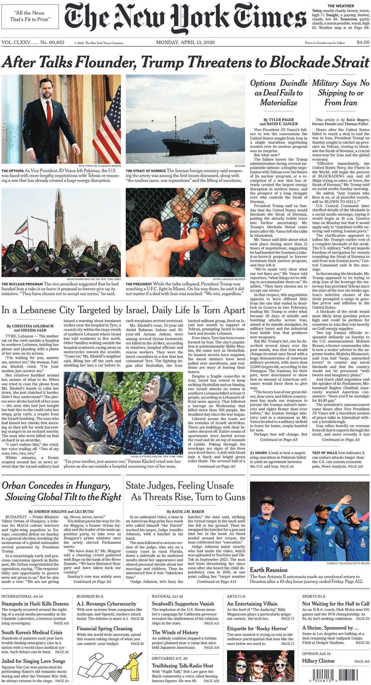 The U.S. military began its blockade of Iranian ports in the Strait of Hormuz on Monday, threatening a nearly week-old cease-fire between Iran and the United States. A few hours later, President Trump said Iran had asked to resume negotiations with American officials, but Iran did not immediately confirm his assertion. A U.S. military official said the blockade was in effect without providing additional details. Mr. Trump had said that other countries would join the effort, but on Monday several European countries refused to be involved. He said on social media shortly after it started that any Iranian ships that approached the blockade would be “immediately ELIMINATED.” Mr. Trump announced the blockade on Sunday after high-level talks over the weekend between American and Iranian negotiators ended without a breakthrough. The president did not say whether the United States had agreed to resume talks. Now Mr. Trump wants to prevent Iran from profiting from oil exports and force its leaders to accept American conditions for ending more than a month of war. Iranian forces have largely barred Western tankers and ships from transiting the strait, a Persian Gulf waterway through which about one-fifth of the world’s oil typically passes. The price of oil has soared by more than 50 percent at times since the war began in late February. The U.S. military said that it would block ships “entering or departing Iranian ports and coastal areas” while allowing other vessels to transit the Strait of Hormuz on their way to other ports. Mr. Trump had conditioned the two-week cease-fire with Iran, which went into effect last Wednesday, on Iran reopening the strait. But in practice, only a handful of tankers have passed through the waterway, with most others avoiding it for fear of Iranian mines or other interference. Two tankers linked to Iran — one carrying naphtha, a petroleum product, and the other carrying gas oil — slipped through the strait hours Monday before the blockade deadline. Kpler, a company that tracks the movement of ships, recorded 14 vessels crossing on Sunday. Iran warned of repercussions. Ebrahim Zolfaghari, an Iranian military spokesman, said Monday that if Iranian ports were threatened, “no port in the Persian Gulf and the Sea of Oman will be safe.” The price of Brent crude, the global benchmark for oil, rose Monday, hovering around $100 a barrel in the early afternoon. U.S. markets opened slightly lower after stocks fell in Asia and Europe. Experts on Iran questioned whether a U.S. blockade would force Iran’s leadership to accept terms that five weeks of war and the killing of many Iranian leaders had not. The Trump administration has been insisting on stopping Iranian nuclear enrichment, as well as confiscating stockpiles of enriched uranium it says could form the basis for a bomb - NYT