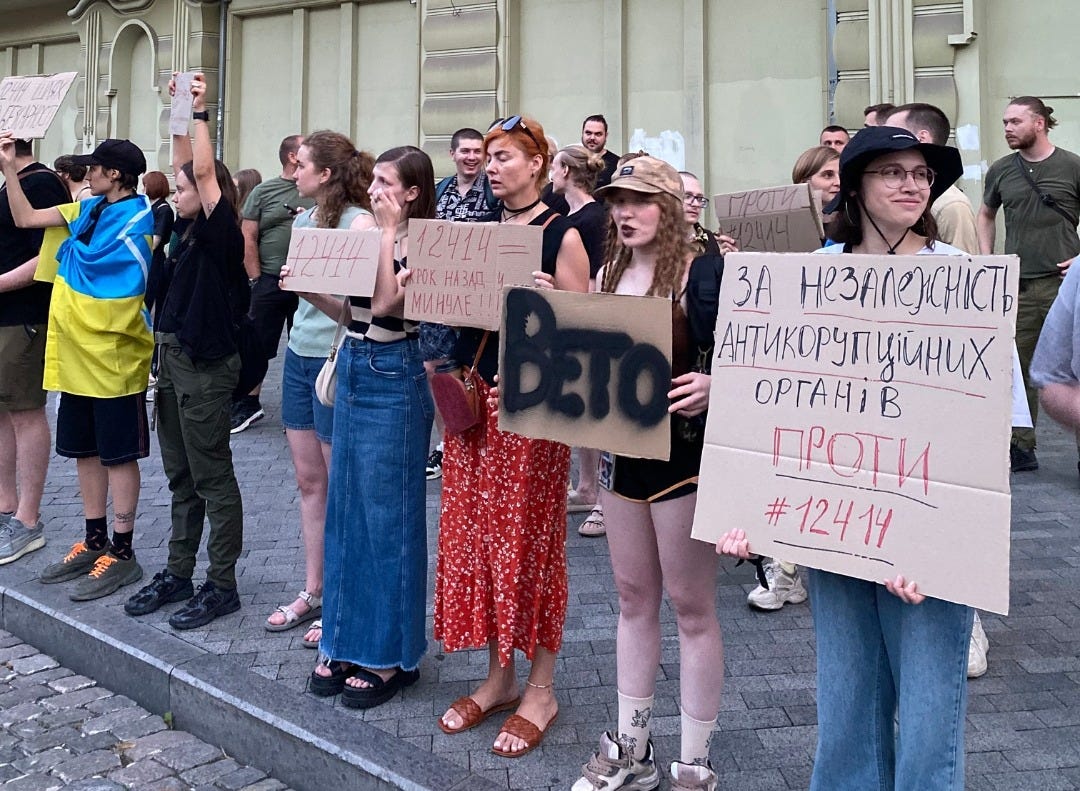 My Hot Take: Ukraine Shoots Itself in the Foot — Again: The controversial parliamentary vote to strip the independence of Ukraine’s top anti-corruption bodies is nothing short of self-sabotage. Yes, the bill still awaits President Zelensky’s signature — but its passage alone has already sparked shock in Brussels and beyond. It’s the clearest sign yet of a presidential administration increasingly bent on consolidating power, even at the expense of transparency, reform, and trust. In a single move, Ukraine risks jeopardizing billions in military and economic aid, and potentially stalling its EU accession — all for short-term political control. For those who still insist Ukraine’s corruption problem is “overblown,” I’d urge them to speak with the countless businesspeople who are stifled by bribes and red tape — or the Ukrainians abroad who say they won’t come back unless peace is matched by real reform. War is no excuse for backsliding. Zelensky’s government was elected on a promise of change. The West is watching. Ukrainians are watching. And they will not accept a return to the old ways. As thousands of protesters shouted in unison below the presidential complex today - ганьба (shame).