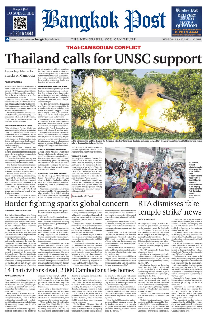 Wechayachai on Friday condemned Cambodia for committing serious war crimes by firing at Thai communities and hospitals and urged the international community to join in condemning these actions while martial law was expanded. In a statement read at Government House, Mr Phumtham said that Cambodia was attacking Thailand. He expressed disappointment that Cambodia opened fire despite Thailand’s patience and preference for peaceful solutions according to international laws and humanitarian principles. The Thai foreign affairs minister informed the United Nations secretary-general and the UN Security Council on Thursday about “the indiscriminate attacks, especially those on innocent people.” The minister called for the international community to condemn “this inhumane act.” - Bangkok Post