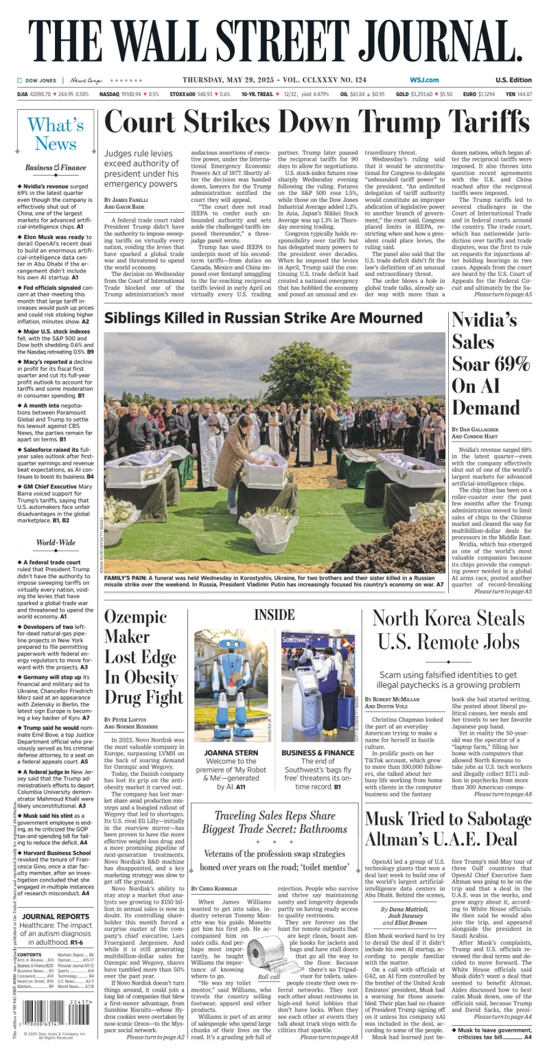A panel of federal judges on Wednesday blocked President Trump from imposing some of his steepest tariffs on China and other U.S. trading partners, finding that federal law did not grant him “unbounded authority” to tax imports from nearly every country around the world. The ruling, by the U.S. Court of International Trade, delivered an early yet significant setback to Mr. Trump, undercutting his primary leverage as he looks to pressure other nations into striking trade deals more beneficial to the United States. Before Mr. Trump took office, no president had sought to invoke the International Emergency Economic Powers Act, a 1977 law, to impose tariffs on other nations. The law, which primarily concerns trade embargoes and sanctions, does not even mention tariffs. But Mr. Trump adopted a novel interpretation of its powers as he announced, and then suspended, high levies on scores of countries in April. He also used the law to impose tariffs on products from Canada and Mexico in return for what he said was their role in sending fentanyl to the United States. On Wednesday, the Court of International Trade, the primary federal legal body overseeing such matters, found that Mr. Trump’s tariffs “exceed any authority granted” to the president by the emergency powers law. Ruling in separate cases brought by states and businesses, a bipartisan panel of three judges essentially declared many, but not all, of Mr. Trump’s tariffs to have been issued illegally. It was not clear precisely when and how the tariff collections would grind to a halt. The ruling gave the executive branch up to 10 days to complete the bureaucratic process of ending them. The Trump administration immediately filed its plans to appeal in the U.S. Court of Appeals for the Federal Circuit. A White House spokesman, Kush Desai, sharply rebuked the court, saying in a statement that unfair trade relationships had “decimated American communities, left our workers behind and weakened our defense industrial base — facts that the court did not dispute.” - NYT