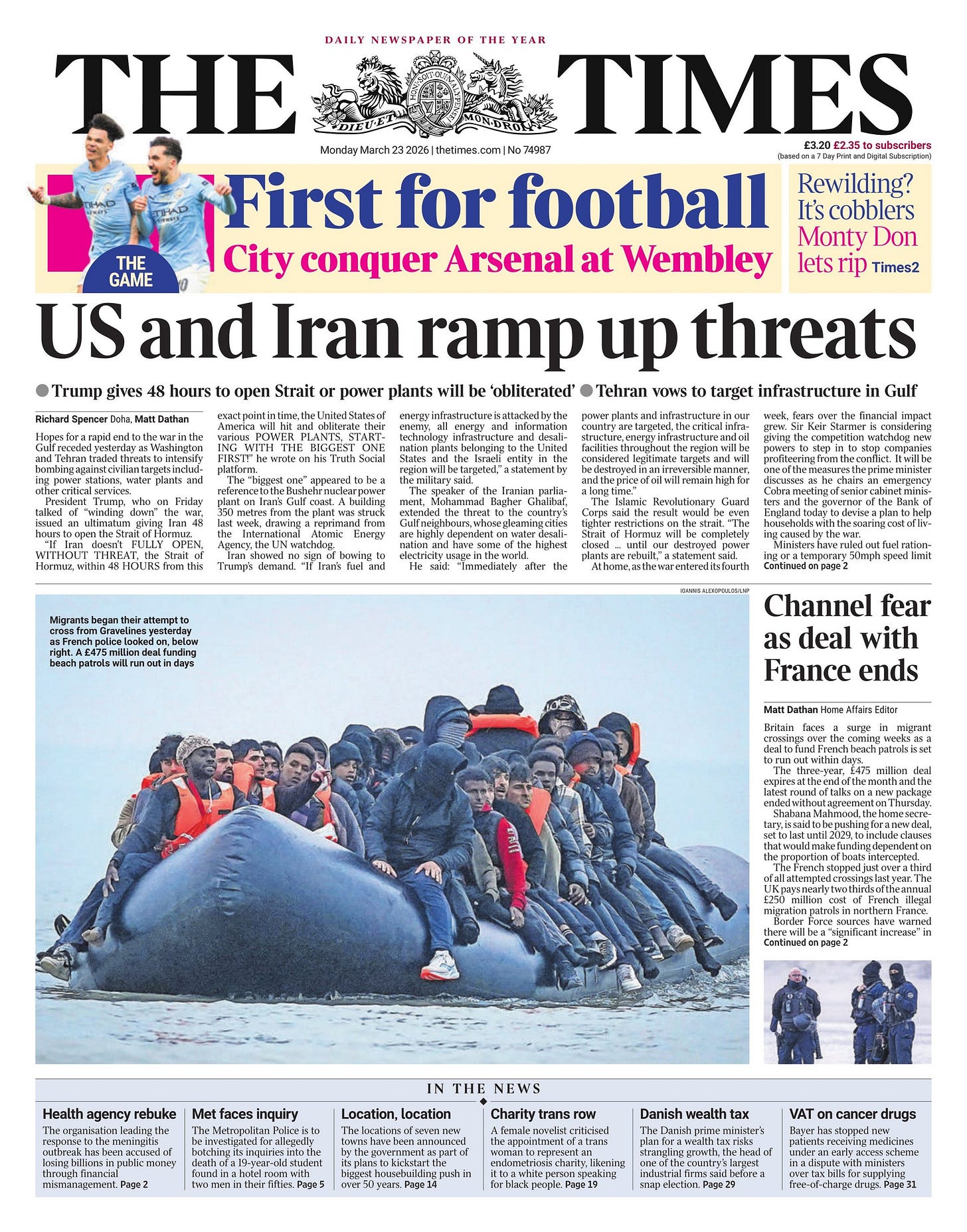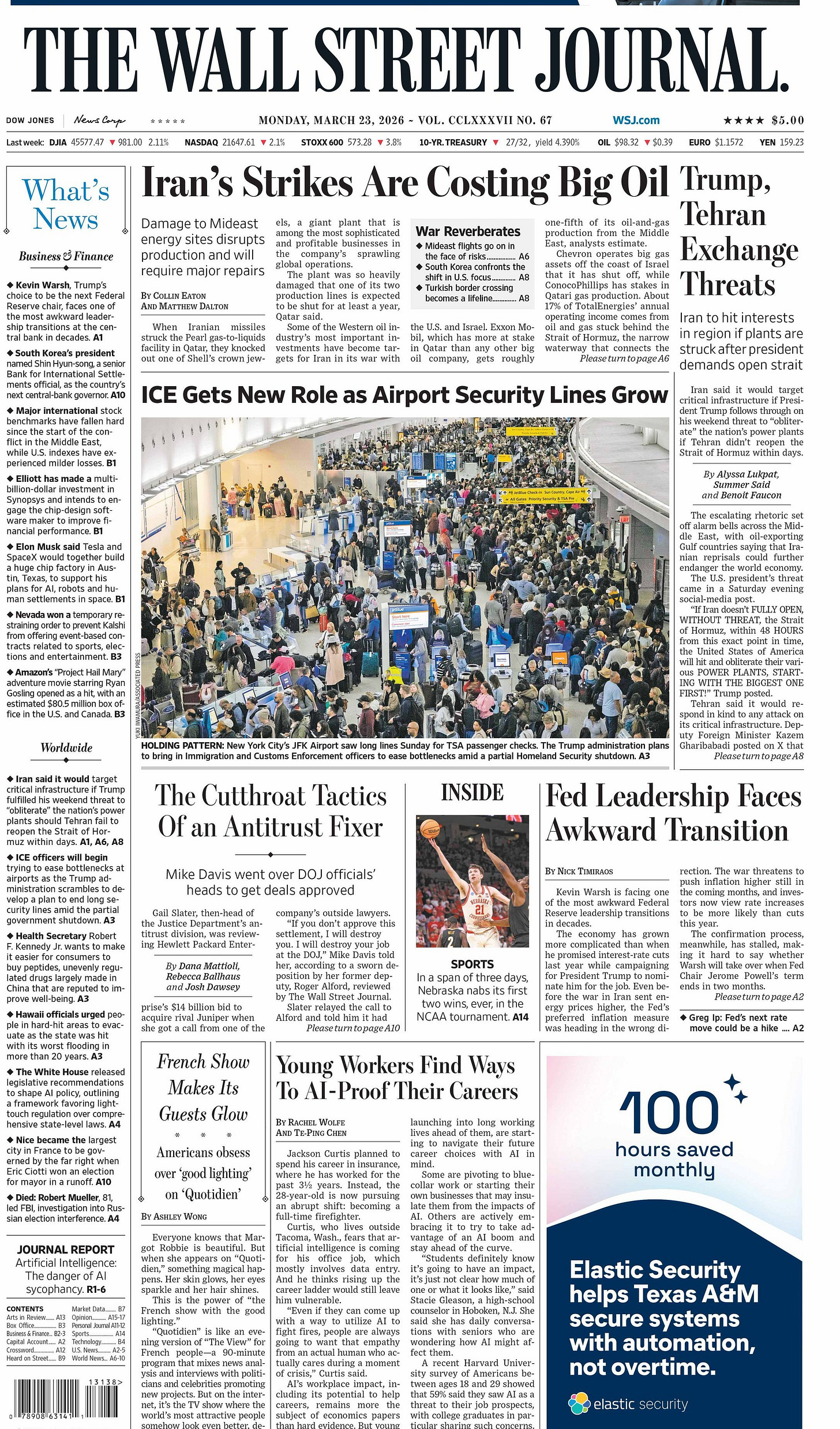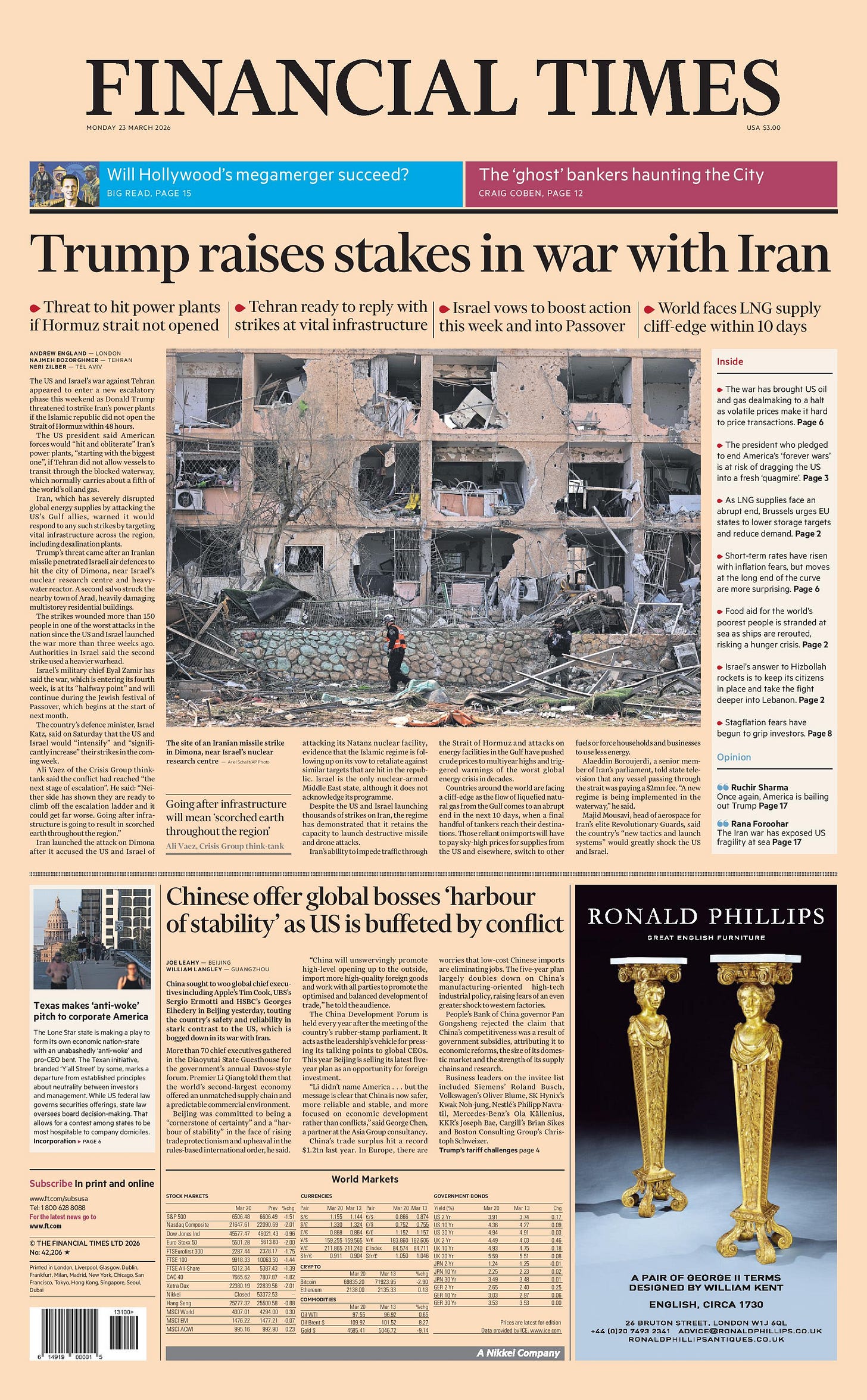 President Trump said Monday that the United States and Iran were negotiating a “total resolution of our hostilities in the Middle East,” and that he would postpone any American attacks on Iranian power plants by five days. Iran, at least publicly, rejected any progress in ending the U.S.-Israeli war on the country, now in its fourth week. American, Israeli and Iranian officials have frequently given clashing statements throughout the war as they seek to advance their competing agendas and motives. Mr. Trump himself has often issued contradictory pronouncements about his plans for the next steps in the conflict, sometimes on the same day. On Saturday, Mr. Trump had threatened to bomb Iran’s power plants after 48 hours unless Iran agreed to fully reopen the Strait of Hormuz, a critical oil shipping route in the Persian Gulf. Iran’s foreign ministry suggested there were no talks with the United States although it noted that there had been “regional initiatives” aimed at reducing tensions. The ministry argued Mr. Trump’s statements were part of an effort “to reduce energy prices and to buy time for implementing his military plans,” according to Iran’s Mizan news agency. Analysts and officials say there is no clear offramp for the American-Israeli air war with Iran, which began on Feb 28. and has ignited a wider regional conflict. Despite Mr. Trump’s calls for the ouster of the Islamic Republic and his vow to help Iranians overthrow their leaders, the Iranian government remains in place, as is much of its nuclear program. The foreign minister of Oman, which has frequently mediated between the United States and Iran, said on social media shortly before Mr. Trump’s announcement that Oman was working to establish “safe passage arrangements for the Strait of Hormuz.” “Whatever your view of Iran, this war is not of their making,” the minister, Badr al-Busaidi, said. “This is already causing widespread economic problems and I fear they promise to get much worse if the war continues.” - NYT