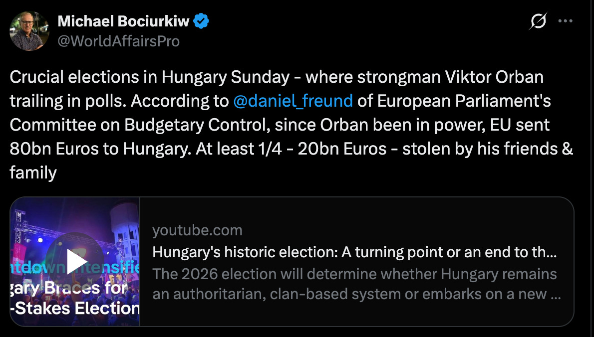 Viktor Orban, uniquely endorsed by both U.S. President Donald Trump and the Kremlin, could lose his 16-year iron grip on power on Sunday, opinion polls indicate, in an election many Hungarians believe will decide their country’s fate in Europe. Orban, the European Union’s longest-serving prime minister, has led Hungary since 2010, entrenching his power by curbing independent media and democratic rights and building an “illiberal democracy” that has earned him fans on Europe’s far right and in Trump’s Make America Great Again (MAGA) movement. However, three years of economic stagnation and soaring living costs, along with the enrichment of oligarchs close to the government, have angered voters. Orban’s campaign has also been ruffled by press reports that his government has colluded with Moscow. A former Orban loyalist, Peter Magyar, has successfully tapped into Hungarians’ discontent and his centre-right Tisza party now comfortably leads most polls. But political analysts also caution that undecided voters, a redrawing of the electoral map in favour of Orban’s Fidesz and a high proportion of ethnic Hungarians in neighbouring countries - who mostly back the ruling party - create a mood of uncertainty. They say anything from a Tisza supermajority - able to change the constitution - to a Fidesz majority remains possible. The stakes could not be higher for the Central European nation of 9.6 million people and for the continent. “This is one of the most momentous elections in Europe and for Europe in many years,” said Gregoire Roos, director of the Europe, Russia and Eurasia Programmes at Chatham House. “In Moscow, Hungary has been seen as a precious trouble-making interlocutor within the EU — maintaining energy ties... and adopting, by far, the toughest tone vis-a-vis Ukraine than any other EU country. In the United States, Hungary has drawn attention as a laboratory of sovereigntist politics.” The Trump administration’s public support for Orban was crowned this week with a visit by U.S. Vice President JD Vance who attacked what he called “disgraceful” EU interference in the vote. A European Commission spokesperson said elections were “the sole choice of the citizens” - Reuters