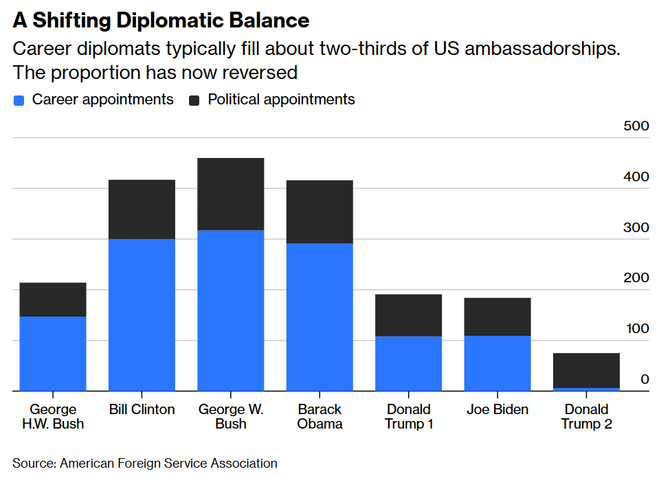 US diplomatic corps are but a shadow of their former self: out of 195 ambassadorial postings around the world, more than 110 sat empty as of early March - including in countries as vital to US interests as Germany and South Korea.