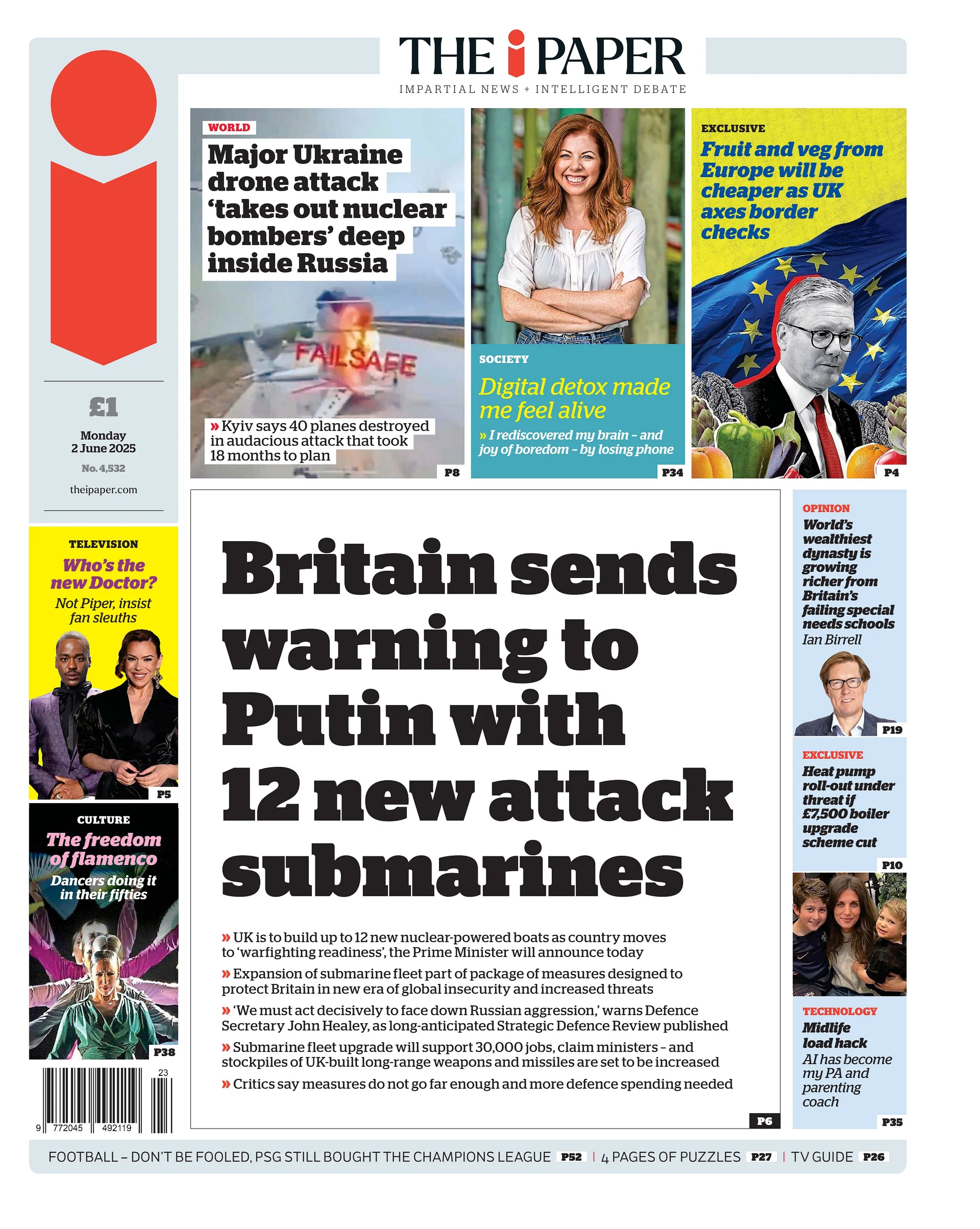 Prime Minister Keir Starmer of Britain vowed Monday to bring his country to “war-fighting readiness,” announcing plans to build up to 12 new attack submarines and invest billions of pounds in weapons, to fortify for a world caught between a hostile, aggressive Russia and a retrenching United States. The ambitious rearmament is part of a strategic defense review by the government, which laid out the threatening new landscape and called for increased production of drones and the stockpiling of more munitions and equipment. “The threat we now face is more serious, more immediate and more unpredictable than at any time since the Cold War,” Mr. Starmer said on Monday at a shipyard in Glasgow. He pointed to “war in Europe, new nuclear risks, daily cyberattacks,” and “growing Russian aggression,” in British waters and skies. The strategic review was set up last year soon after Mr. Starmer won a general election. But its task was given fresh urgency amid growing evidence of President Trump’s weakened commitment to European security and his ambivalent and, at times, ingratiating attitude toward President Vladimir V. Putin of Russia. Among its recommendations: the procurement of up to 7,000 British-built long-range weapons and the creation of a new cyber-command, alongside an investment of a billion pounds, equivalent to $1.35 billion, in digital capability. Money will be invested in protecting critical British underwater infrastructure as well as in drones, which have proved highly effective in the war in Ukraine - NYT