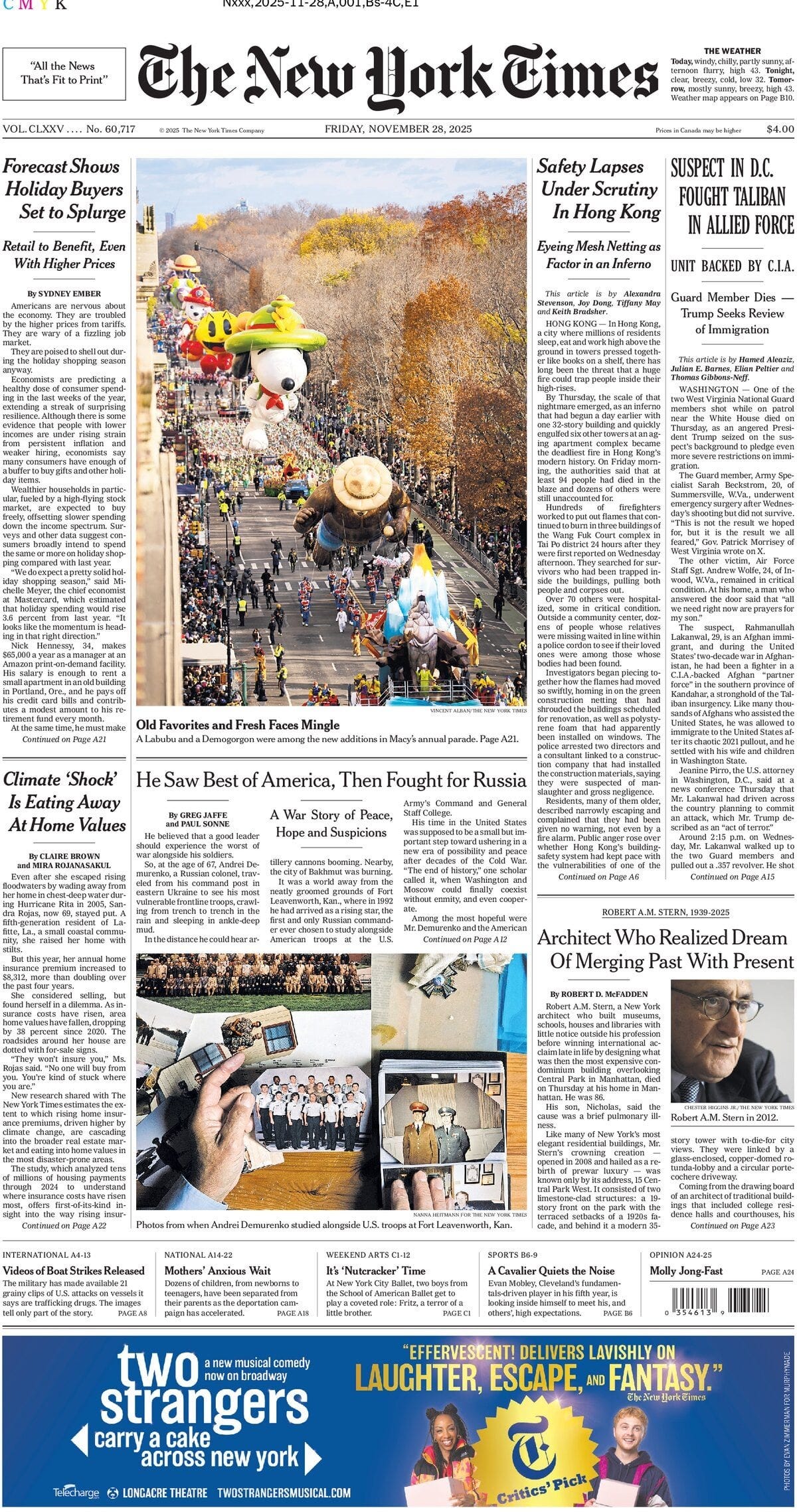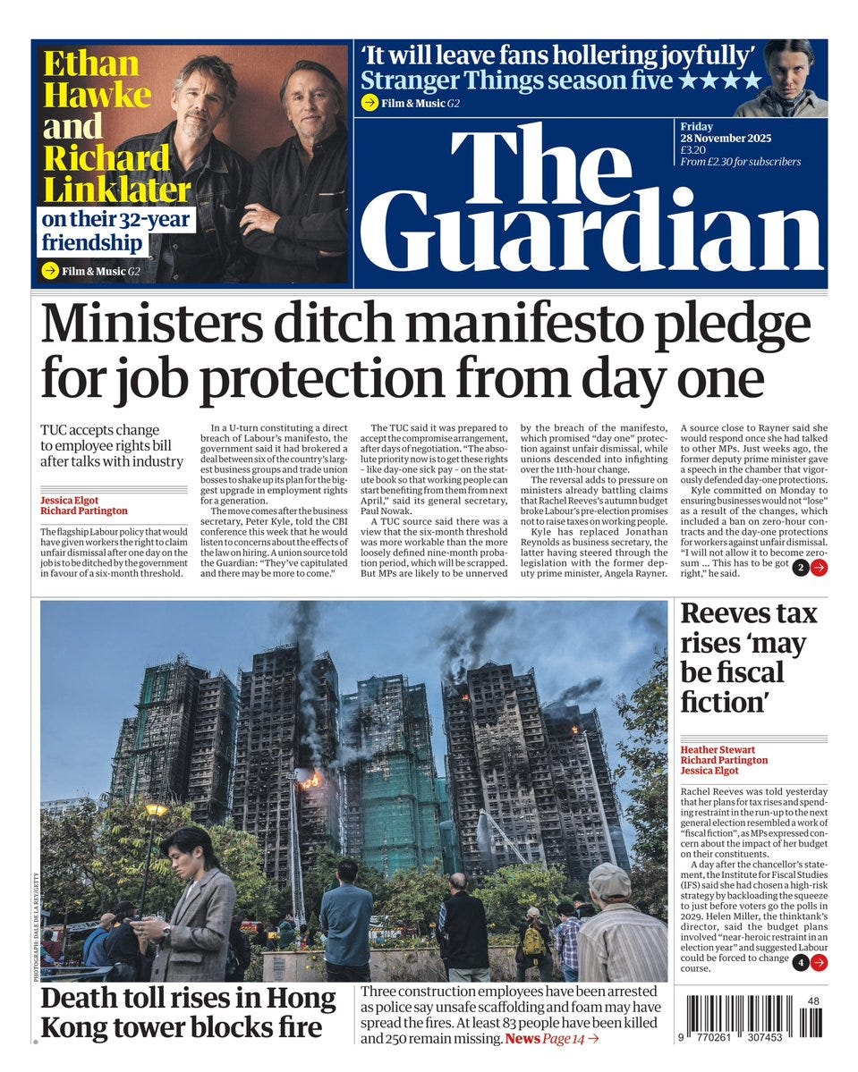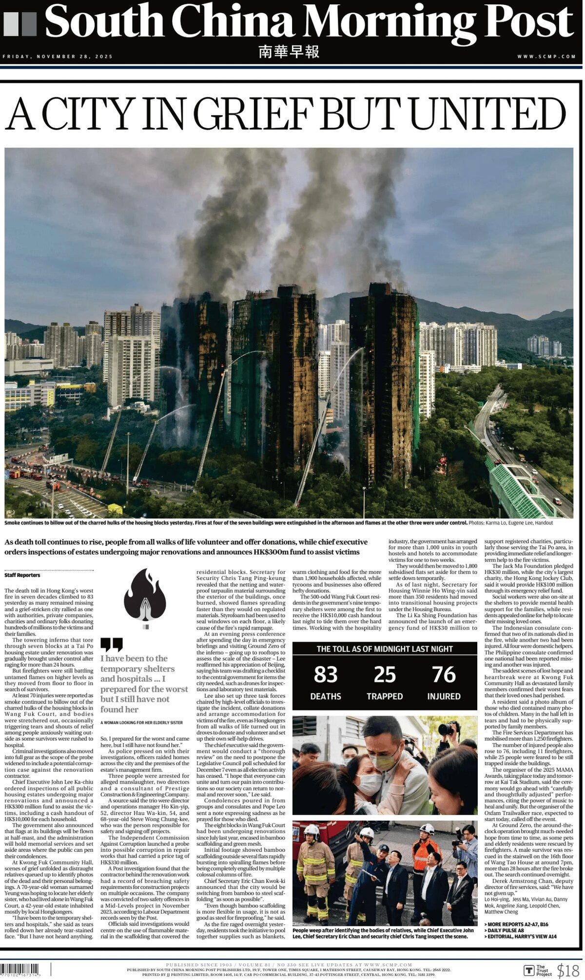 In Hong Kong, 128 people, including a firefighter, have been confirmed dead in one of the region’s deadliest fires, the South China Morning Post reported. The fire was first reported at 2.51pm on Wednesday and soon grew into an inferno, with huge plumes of dark smoke billowing high into the sky, and the flames quickly spreading to seven of the eight blocks in the estate. Initial footage showed bamboo scaffolding outside several flats rapidly bursting into spiralling flames, before being completely engulfed in multiple towering columns of fire. Burning sections of green scaffolding mesh fell to the ground. At least 16 bodies are still in the buildings. Seventy-nine people have been injured, including 12 firefighters and the status of 200 people are unclear. Today, more bodies have been retrieved from the fire scene wrapped in black bags, while full-scale rescue work is ongoing, with a woman, an elderly man and pets evacuated. The eight residential blocks in the estate had been undergoing renovations since July 2024, covered in bamboo scaffolding and green mesh. Authorities say highly flammable styrofoam material used in renovation works caused fire to spread rapidly. The government has launched criminal investigations to find cause of blaze. Two directors with Will Power Architects, consultant firm of the renovation company arrested by Independent Commission Against Corruption on Friday. Three senior staff members of renovation company Prestige Construction & Engineering Co Limited earlier arrested for alleged manslaughter. The ICAC launches corruption probe into repair works that had price tag of HK$330 million