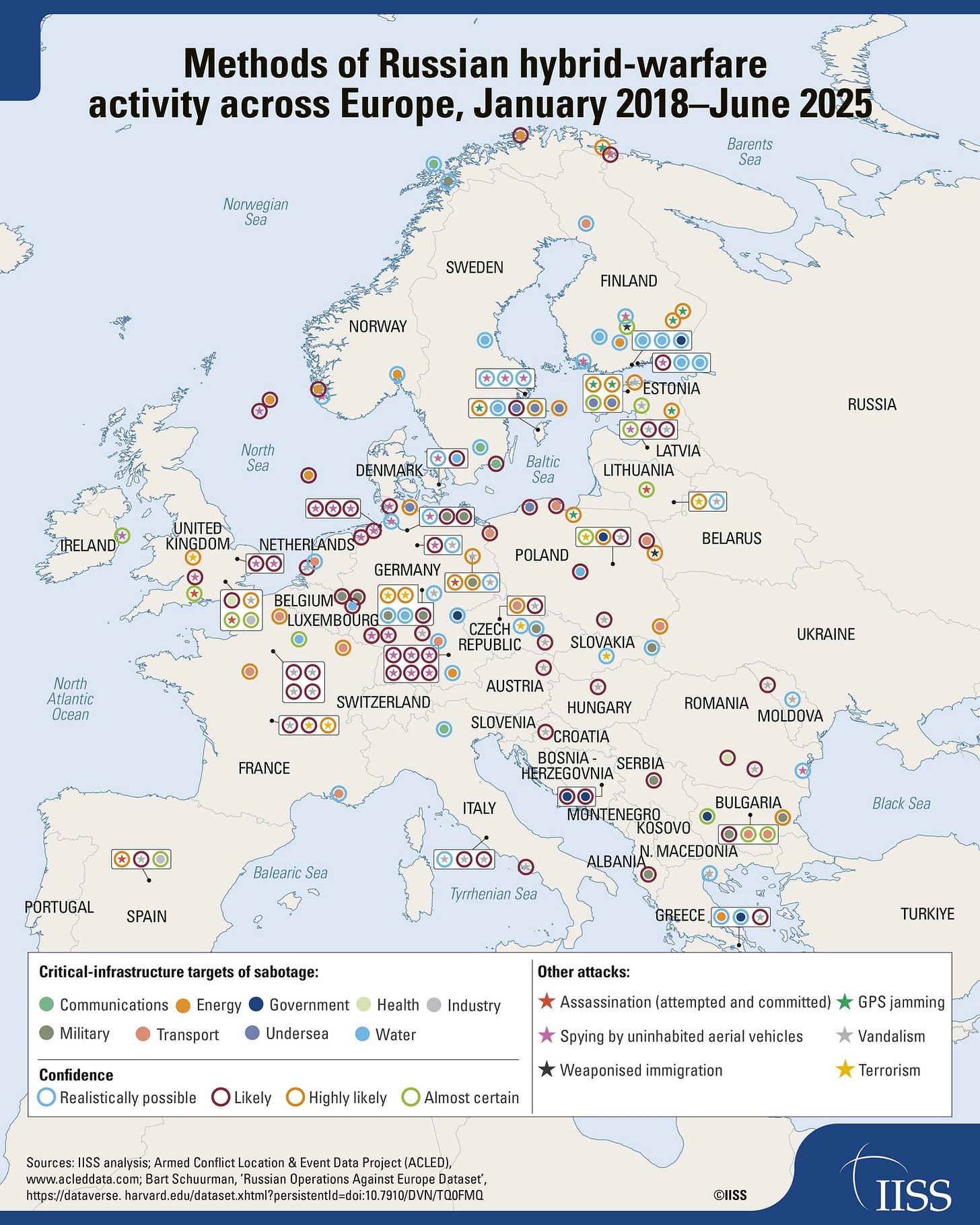 The IISS has produced the most comprehensive open-source database currently available on Russian sabotage operations across Europe and its periphery. It captures the full spectrum of activity with physical effects: from sabotage on undersea cables to GPS blocking across multiple domains and geographies. See below….