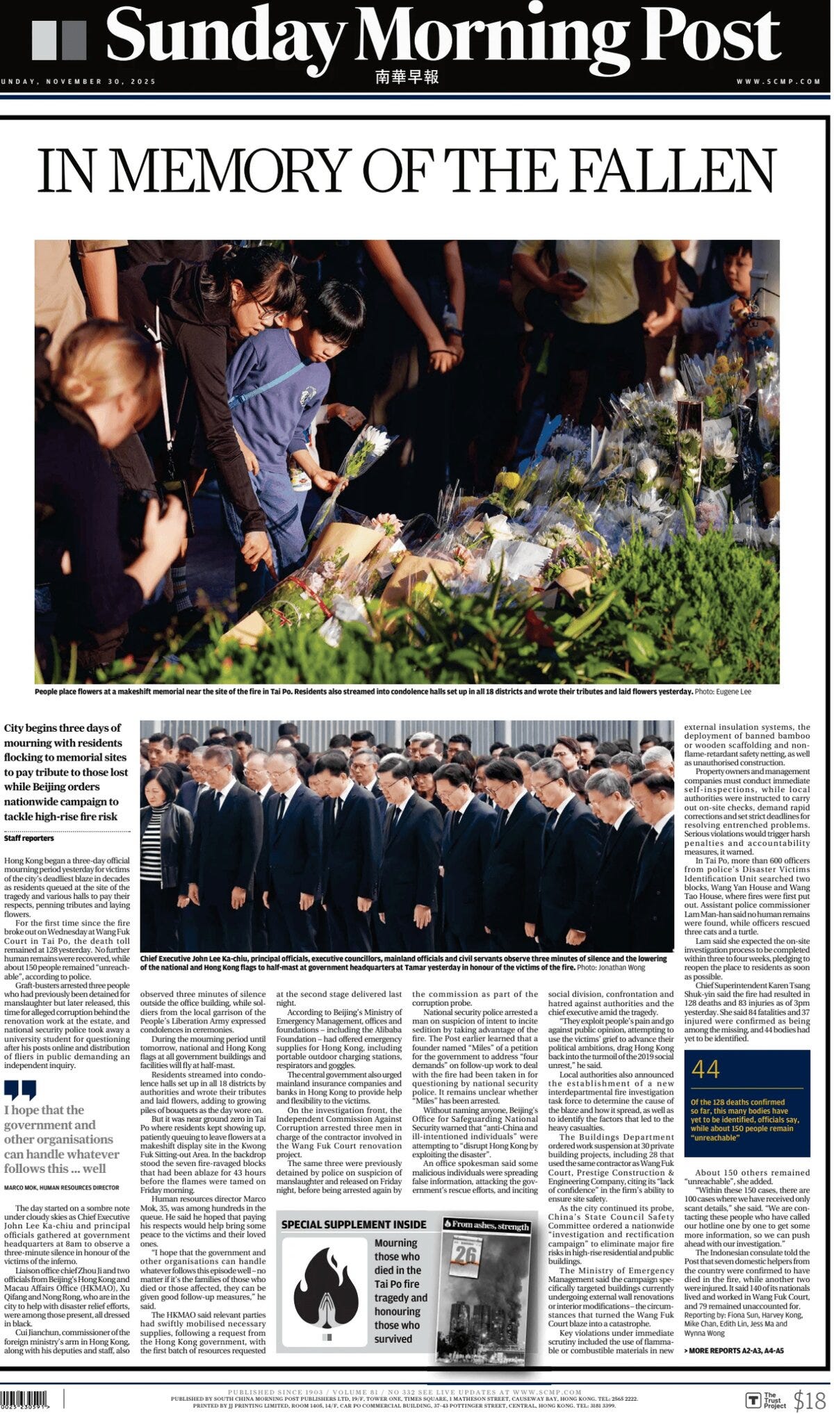 Thousands of mourners poured into Hong Kong’s Tai Po district on Sunday, forming a solemn river of remembrance for the 146 lives lost in the territory’s deadliest fire in more than seven decades, while Beijing called for unity and healing as a massive rescue and recovery operation continued amid the charred ruins. The scale of the calamity was evident, as the Disaster Victim Identification Unit (DVIU) discovered 18 more bodies in the wreckage of Wang Fuk Court in Tai Po following Wednesday’s blaze. They have completed searches in four of the seven affected buildings, but about 40 people remain unaccounted for. As the city grieves, a sweeping resettlement effort is under way. Deputy Financial Secretary Michael Wong Wai-lun said 1,827 survivors of the blaze had moved into temporary homes such as hotels and transitional housing. The 2021 census found that about 4,600 people lived in the housing estate, including in the unaffected block - SCMP