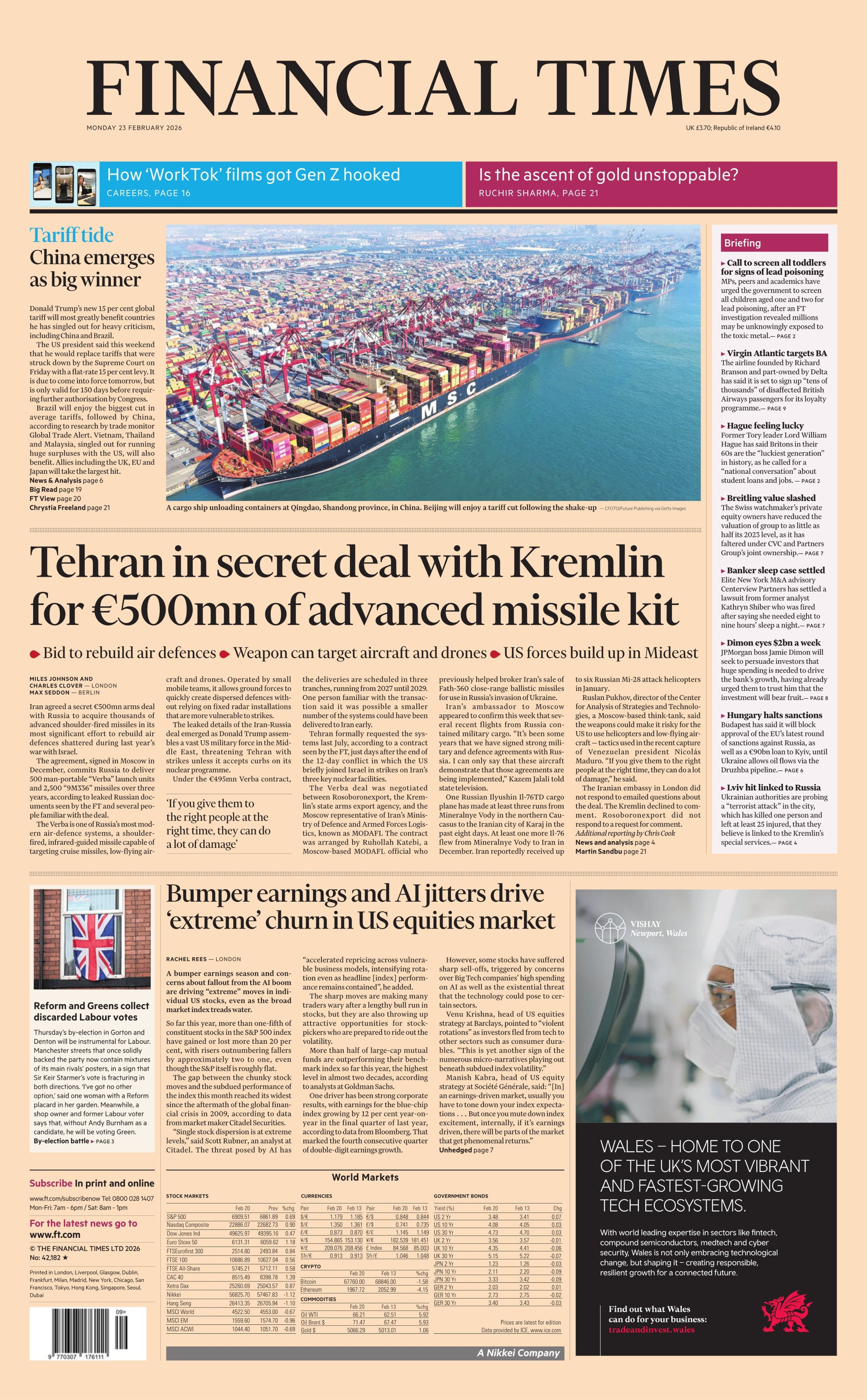 Iran has signed a secret 500 million euro ($589 million) deal with Russia to acquire thousands of advanced shoulder-fired missiles, the Financial Times (FT) reported, citing leaked Russian documents and sources familiar with the agreement. The arms deal was signed in Moscow in December, and requires Russia to send Iran 500 “Verba” Man-Portable Air-Defense System (MANPADS) launch units and 2,500 9M336 surface-to-air missiles over three years, FT reports. The Verba is one of Russia’s most advanced air defense systems, a shoulder-fired, infrared-guided missile capable of targeting cruise missiles, low-flying aircraft and drones. News of the secret missile deal comes as tensions rise alongside ongoing nuclear negotiations between Washington and Tehran, with U.S. President Donald Trump again threatening Iran with possible military action. The agreement between Russia and Iran was negotiated between Russian state weapons exporter Rosoboronexport and a representative of Iran’s Defense Ministry and Armed Forces Logistics (MODAFL), according to FT. Iran officially requested the missile systems in July 2025, following U.S. and Israeli strikes in June. Ukraine’s Foreign Intelligence Service previously reported in August that Iran had sought help from Belarus to restore its damaged air defense and electronic welfare systems after the escalation with Israel. Iran will receive the pledged weapons in three tranches from 2027 to 2029, according to the delivery schedule set out in the deal. Russia and Iran have deepened cooperation in recent years, with Tehran supplying drones and other military equipment used by Russian forces in the war against Ukraine. The two countries held joint naval exercises in the Gulf of Oman and the northern Indian Ocean on Feb. 19, amid reports that U.S. Armed Forces had deployed warships near Iran and were preparing for possible strikes - Kyiv Independent