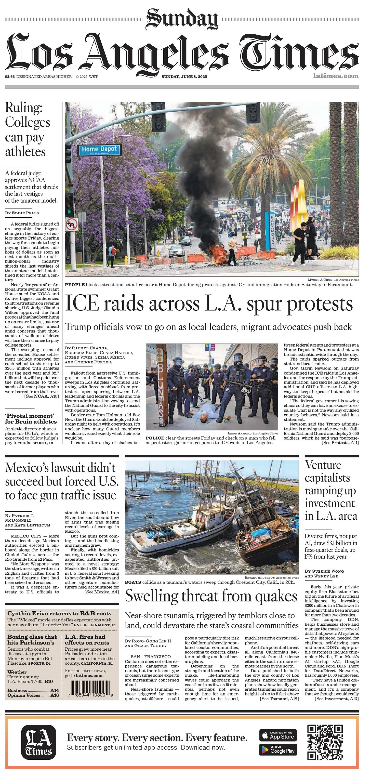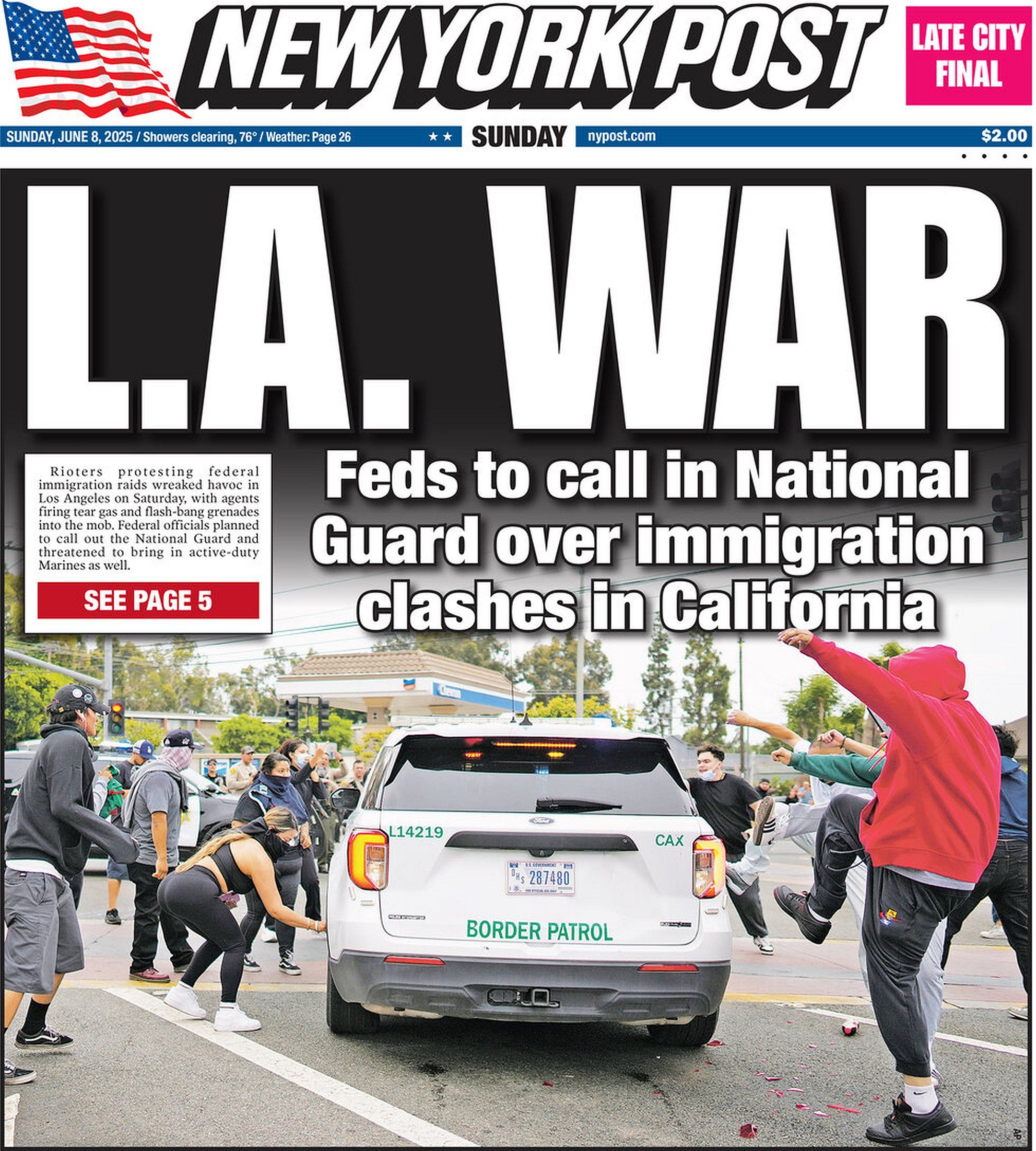 The Trump administration said it would send 2,000 National Guard troops into Los Angeles after a second day in which protesters confronted immigration agents during raids of local businesses. The move marks a major escalation in Trump’s crackdown on illegal immigration and came amid concerns from some officials in California. The Guard has been deployed to Los Angeles previously, but it has been during widespread civil unrest, including the upheaval associated with the 2020 protests following the murder of George Floyd, as well as the riots that occurred after the Rodney King verdict in 1992. Los Angeles has seen several violent clashes during the recent immigration raids, but they have been limited to isolated areas including the Home Depot in Paramount, a location in L.A.’s fashion district and at the Civic Center. Jessica Levinson, a law professor at Loyola Law School, noted that when the National Guard was sent to L.A. before, it was because California requested it and the response was coordinated. But he called the move very troubling. Such deployment typically happen during “extreme circumstances. ... Here it seems it was an early response. And I fear that is to send a message to protesters of the willingness of the federal government to use federal troops to quell protests.” - LA Times
