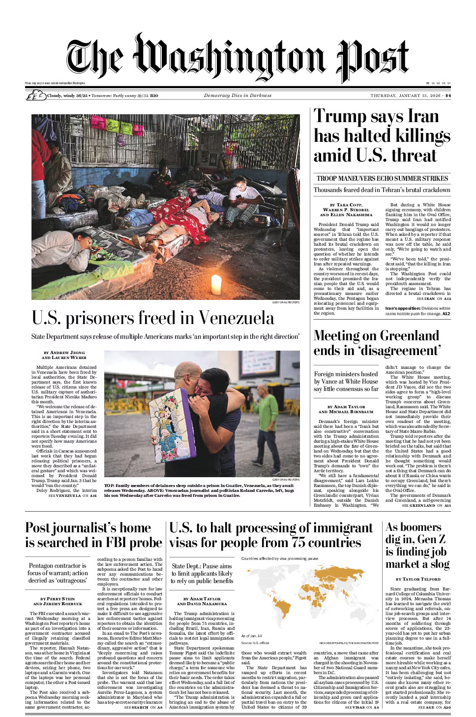 FBI agents searched a Washington Post reporter’s home on Wednesday as part of an investigation into sharing secret government information, officials said, in a move that press advocates said threatened journalistic freedom. The reporter, Hannah Natanson, has covered U.S. President Donald Trump‘s campaign to fire hundreds of thousands of federal workers and shift remaining workers to implementing his agenda. Attorney General Pam Bondi said federal agents had executed the search at the request of the Defense Department. Trump’s Justice Department last year reversed a policy that had barred prosecutors from seizing records from reporters in most circumstances. Press-freedom advocates called the search a dramatic escalation in the Trump administration’s ongoing attacks on news media. In a note to staff, Washington Post Executive Editor Matt Murray said FBI agents searched Natanson's home and seized her electronic devices. He said she and the paper are not a target of the probe, which is linked to a government contractor accused of illegally retaining classified materials. “This extraordinary, aggressive action is deeply concerning and raises profound questions and concern around the constitutional protections for our work,” Murray wrote. Natanson wrote a story in December about her personal experience covering the administration’s efforts concerning federal workers, titled “I am The Post’s ‘federal government whisperer.’ It’s been brutal.” In it, Natanson related the relentless pace of calls and messages she received from former and current federal employees frustrated by the changes. Prosecutors allege the contractor, Aurelio Perez-Lugones, took screenshots of classified intelligence reports and printed those documents, according to a criminal complaint. Investigators also found documents marked “secret” in a lunchbox in Perez-Lugones’ car and in his basement, according to an FBI affidavit- Reuters