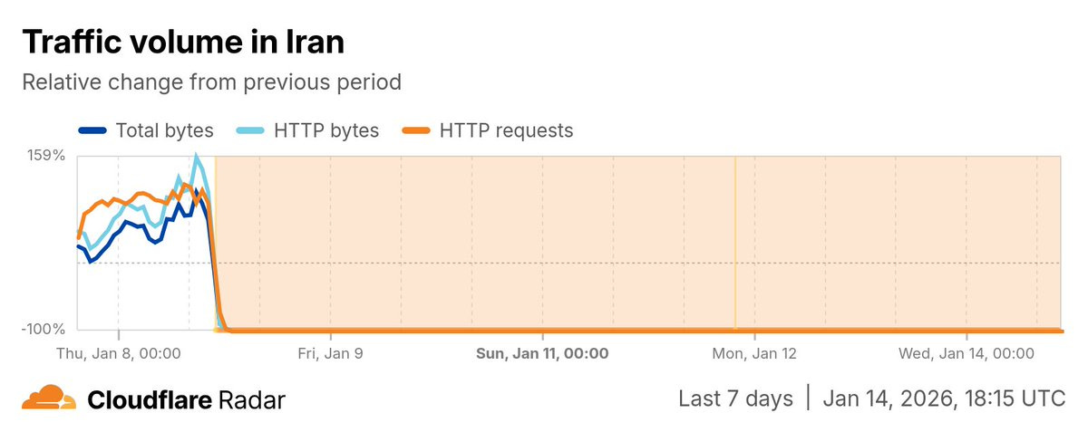 The Internet shutdown in #ran is now in its 7th day, approaching the duration of the country's December 2022 shutdown, and making it one of the longest Internet shutdowns on record, according to Cloudflare Radar.