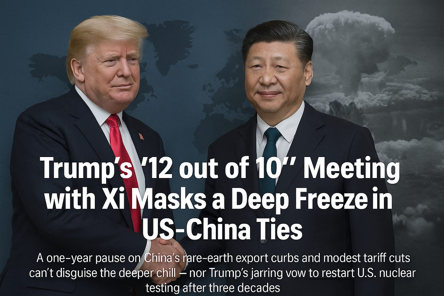 For all the talk of “friendship” and “mutual prosperity,” the Xi–Trump summit in South Korea felt less like détente and more like delay. Trump’s self-graded “12 out of 10” meeting produced few deliverables beyond a one-year truce on rare-earth exports — a temporary pressure valve for industries rattled by Beijing’s leverage over critical minerals. His decision to halve tariffs on Chinese goods (in return for China doing more to control fentanyl trafficking) is headline-grabbing but economically marginal.