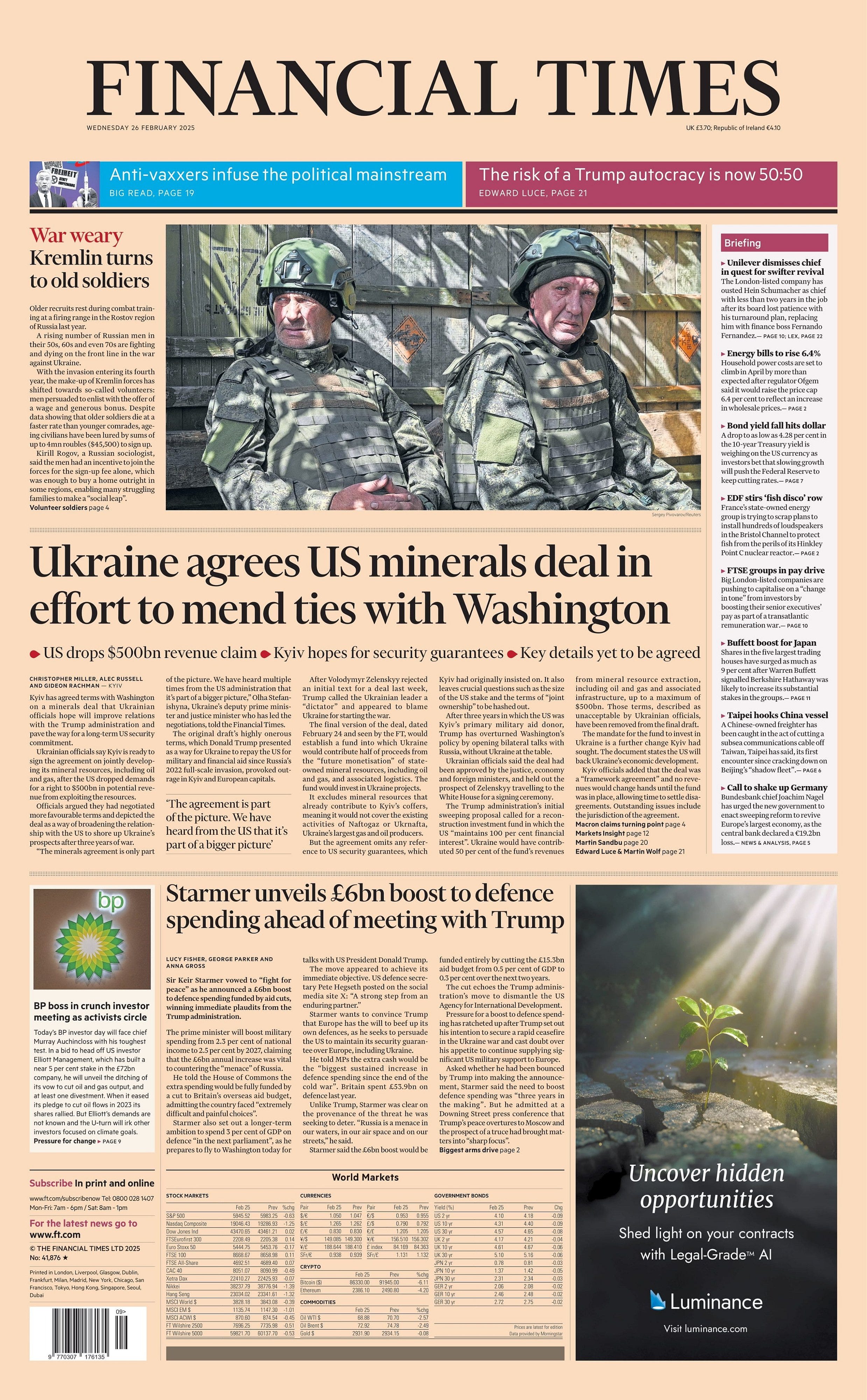 Trump says Volodymyr Zelensky will be in Washington to sign a minerals deal. Keir Starmer has announced that Britain will “fight for peace in Europe” with a generational increase in defence spending