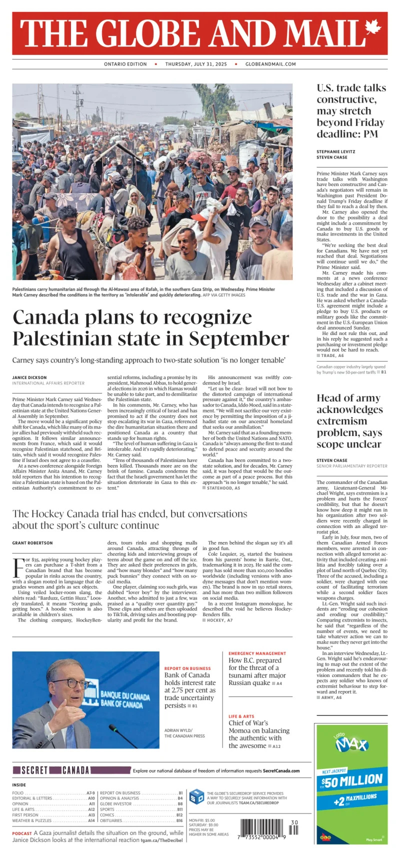 U.S. President Donald Trump took to his social media platform just after midnight on Thursday to say he is not pleased with Canada announcing it will recognize a Palestinian state in September if the West Bank's governing body agrees to make certain commitments. "Wow! Canada has just announced that it is backing statehood for Palestine," Trump posted on Truth Social. "That will make it very hard for us to make a Trade Deal with them. Oh' Canada!!!" Prime Minister Mark Carney confirmed earlier on Wednesday that trade negotiations have not been finalized just two days ahead of the deadline. "It is possible that [negotiations] may not conclude by the first of August," Carney said at a news conference on Wednesday. "But we'll see with the teams there. We're working hard." Trump set an Aug. 1 deadline for Canada to reach a trade deal and has threatened to impose a 35 per cent tariff on goods that don't comply with the Canada-U.S.-Mexico Agreement (CUSMA). That rate would apply to Canadian exports currently being tariffed at 25 per cent, under Trump's emergency powers, citing what he says is a national security threat from fentanyl trafficking. - CBC