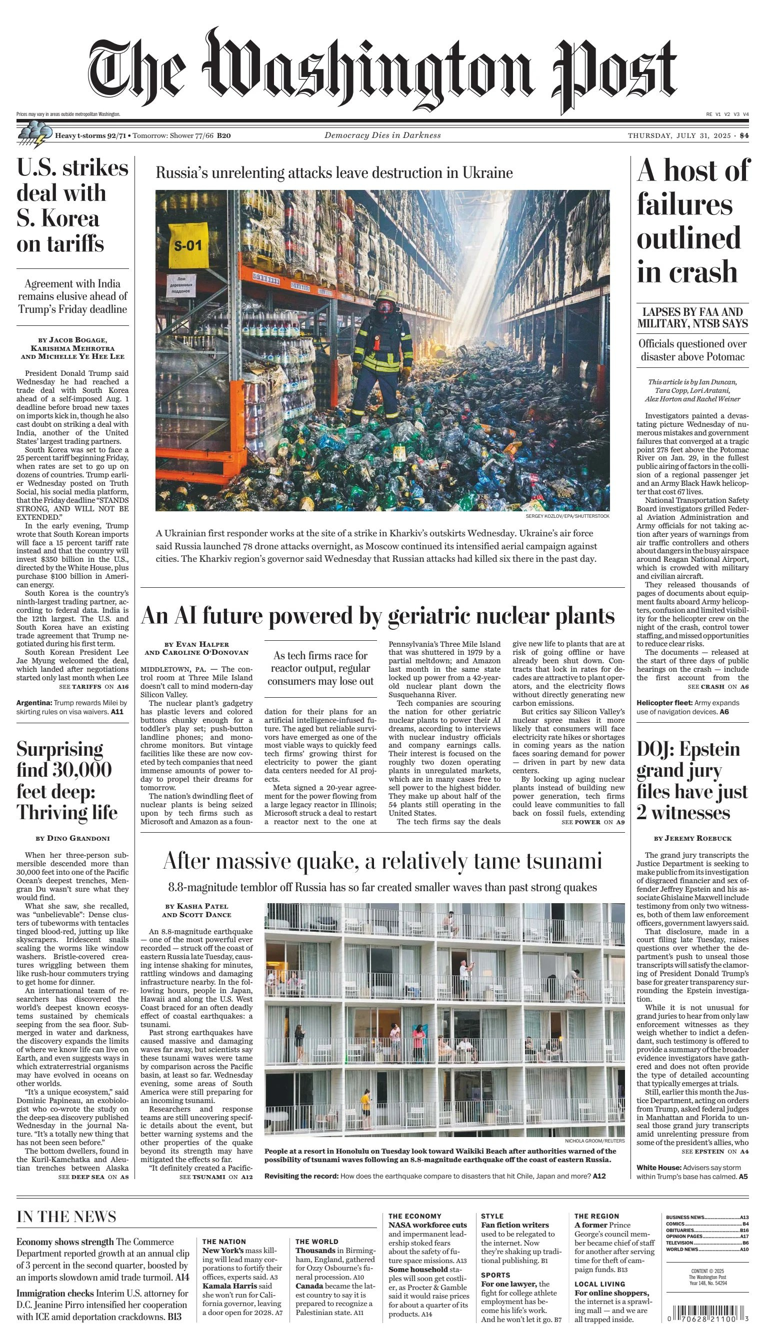 Russia bombarded Kyiv with a missile and drone attack before dawn on Thursday, killing at least eight people, Ukrainian officials said, in an assault that came soon after President Trump had warned Moscow of new sanctions if such violence persisted. Rescuers raced to more than two dozen locations around the Ukrainian capital, Kyiv, to extinguish fires and search for survivors in the rubble of blasted apartment buildings. “We have 52 injured, nearly 30 hospitalized,” Tymur Tkachenko, the head of the city’s military administration, said in a statement. “Among them, nine children were injured.” One child was among those killed. The number of dead and wounded was likely to grow, Mr. Tkachenko said. The assault came shortly after Mr. Trump threatened new sanctions on Moscow if President Vladimir V. Putin of Russia did not put a halt to the bloodshed in 10 days. Russian officials have dismissed that warning - NYT