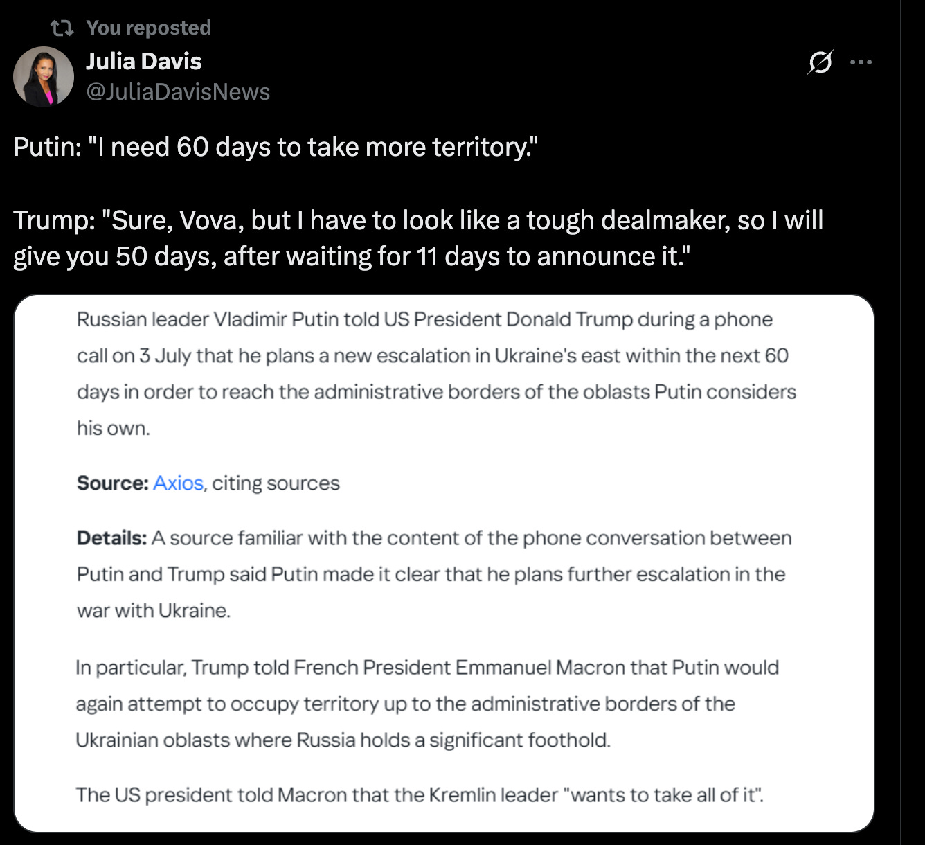 But beyond the rhetoric, the proposal lacked detail — no funding figures, no timeline for weapons deliveries, and no firm commitments. What raised further concern was the head-scratching 50-day grace period Trump is offering Vladimir Putin, especially in light of reports that Putin recently told Trump he needed 60 days to complete a major military escalation in Ukraine’s east. According to Axios, Putin said he planned to intensify operations to seize full control of the four partially occupied Ukrainian regions: Luhansk, Donetsk, Zaporizhzhia, and Kherson.
