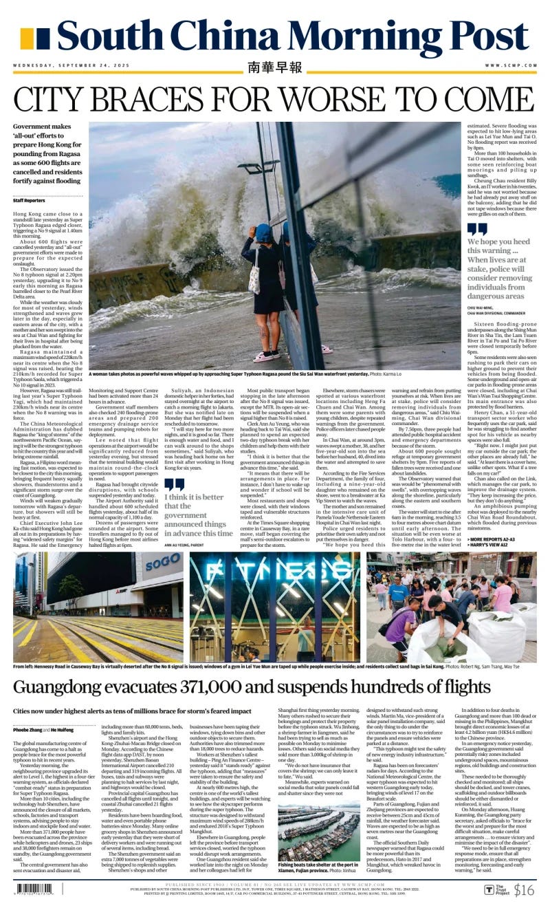 Hong Kong is being lashed by hurricane-force winds and heavy rain as Super Typhoon Ragasa edges closer to the city, with the Observatory upgrading the storm warning to the highest-level No 10 signal at 2.40am on Wednesday, just one hour after issuing the No 9 alert. Maximum sustained wind speeds near Ragasa’s centre earlier reached 220km/h (137mph). The forecaster has warned the weather will be “persistently adverse” on Wednesday with frequent heavy showers and thunderstorms, while seas will be rough with swells and overtopping waves over the shoreline, which will be particularly significant along the eastern and southern coasts. All kindergarten, primary and secondary school classes for Wednesday have been cancelled. At least 700 flights have also been cancelled - SCMP
