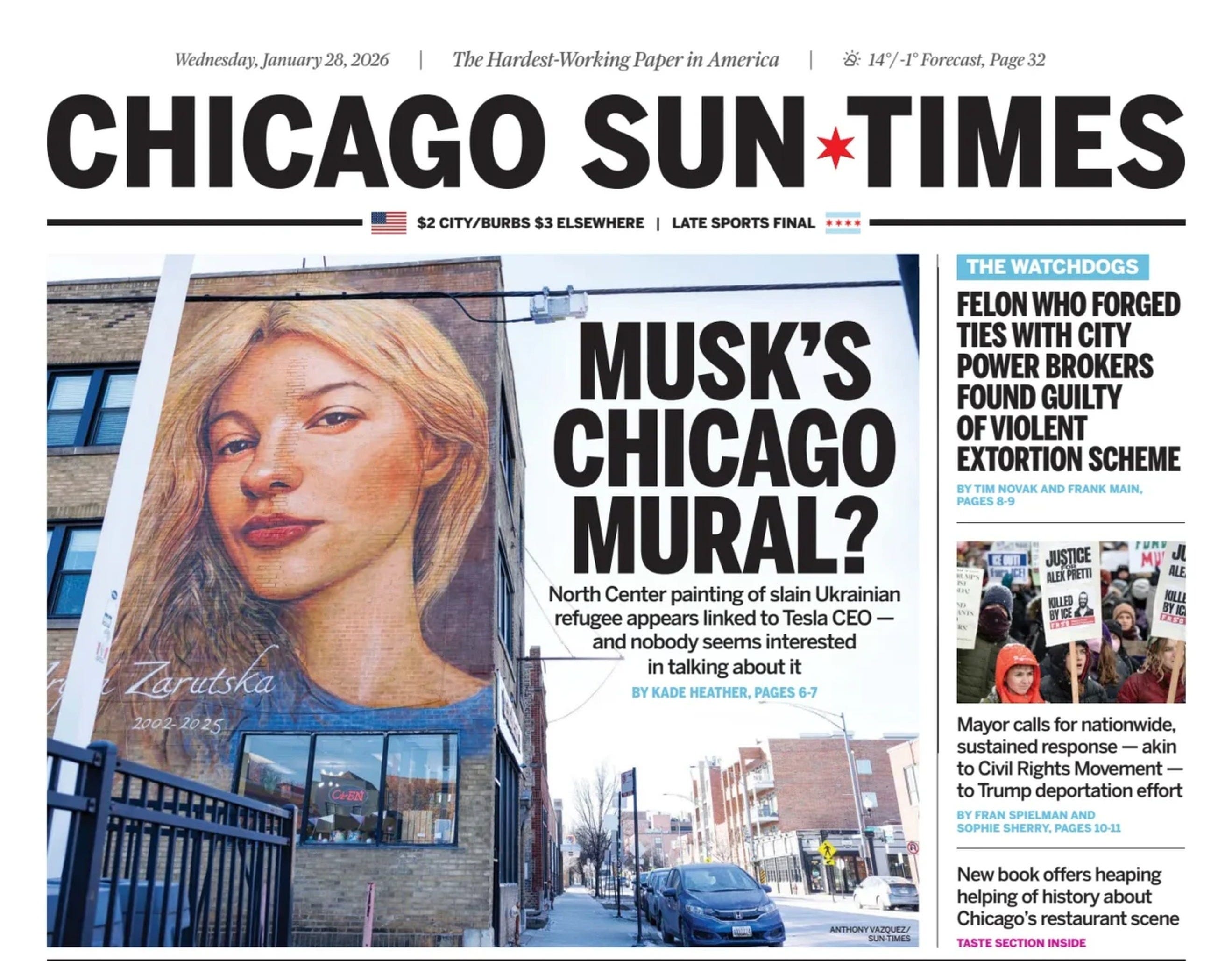 A mural of Iryna Zarutska, a 23-year-old Ukrainian refugee who was fatally stabbed in August while riding a train home from work in North Carolina, mysteriously appeared on a building in Chicago and may appear across the U.S. Elon Musk and other supporters of Donald Trump, who has blamed Democrat policies for her death, have led an effort to paint murals depicting her nationwide, the Chicago Sun-Times reported. In Chicago, near the corner of Western and Montrose avenues, a large mural of Iryna has conspicuously appeared on the side of a brick building where a taqueria is situated. It depicts her in a blue shirt, from her shoulders up, along with her name and “2002-2025” written in white. No artist signed the mural. Video of the attack went viral on social media, and politicians from both sides quickly condemned the killing. Republicans, including Trump and his supporters, blamed Democrats for Zarutska’s death because the man charged in the stabbing had been in and out of jail several times over the last decade. The man charged in the killing, Decarlos Brown Jr., 34, had previously served nearly six years in prison for robbery, and had been arrested 14 times in North Carolina dating back more than a decade ago. Trump and other MAGA Republicans have used the case as a political symbol to call for more forcible punishments against people convicted of violent crimes — whether suffering from mental illness or not. Vice President JD Vance said Democrats’ “soft-on-crime” policies were responsible for Zarutska’s death. “She came from a war-torn country, sought shelter in the United States, and because of soft-on-crime policies she was murdered here and not in the war-torn country she came from. Isn’t that a disgrace?” Vance said, speaking to a crowd in September in North Carolina. The painting in Chicago is the only mural seen in its vicinity in the North Center neighborhood, which isn’t necessarily known for its street art, like other parts of the city.