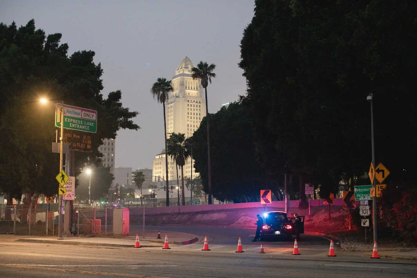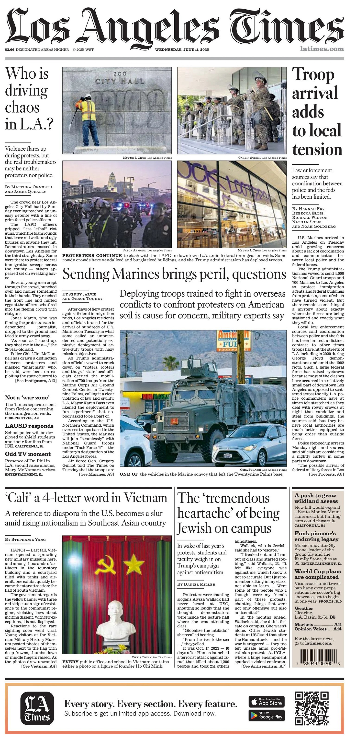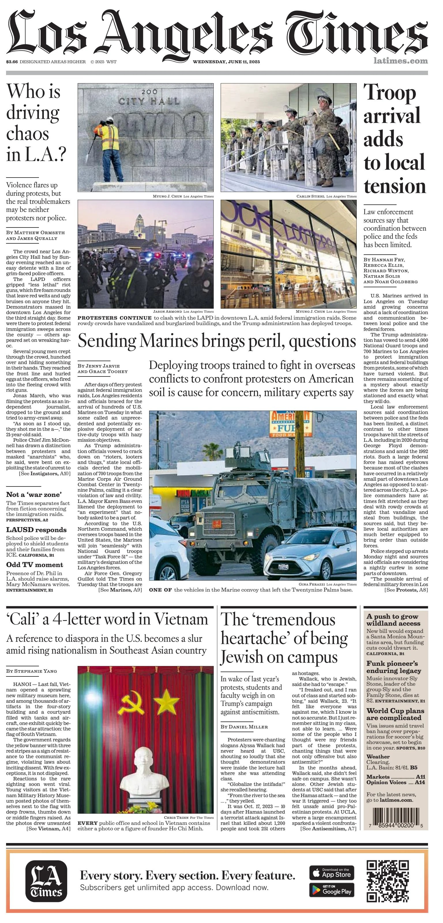 After days of immigration protests, downtown L.A.’s first night under curfew ended Wednesday morning with dozens of arrests, but less destruction and fewer clashes between protesters and authorities. The curfew went into effect at 8 p.m. Tuesday and lifted at 6 a.m. the following day. The Los Angeles Police Department reported that at least 25 people were arrested for violating the curfew in its first hours. Separately, U.S. Marines arrived in Los Angeles on Tuesday amid growing concerns about a lack of coordination and communication between local police and the federal forces. The Trump administration has vowed to send 4,000 National Guard troops and 700 Marines to Los Angeles to protect immigration agents and federal buildings from protests, some of which have turned violent. But there remains something of a mystery about exactly where the forces are being stationed and exactly what they will do. Gov. Gavin Newsom meanwhile accused President Trump of intentionally fanning the flames of the Los Angeles protests and “pulling a military dragnet across” the city endangering peaceful protesters and targeting hardworking immigrant families. The Democratic governor’s comments were a forceful rebuke to the president’s claims that deploying the California National Guard and U.S. Marines to the city was necessary to control the civil unrest - LA Times