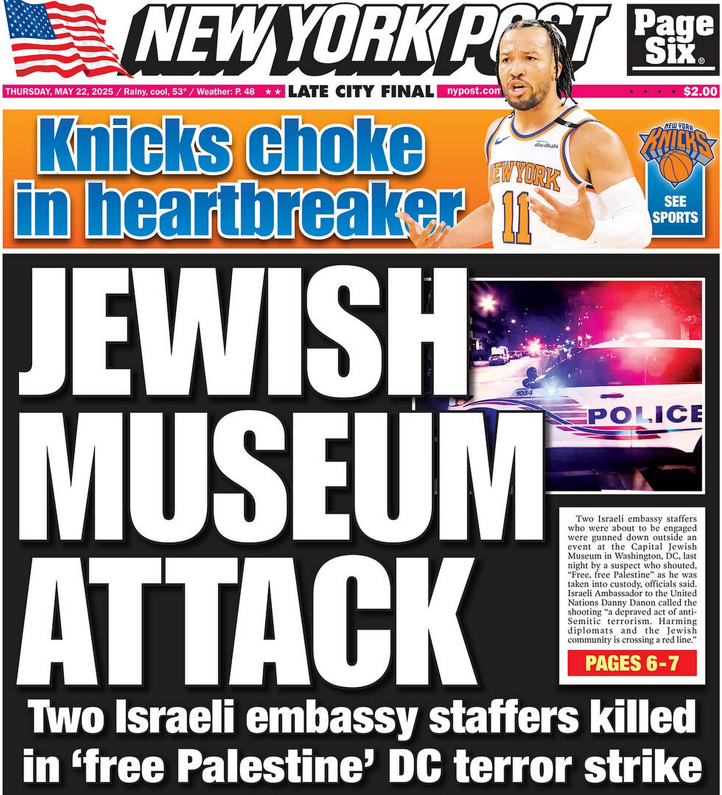 Two staff members from the Israeli Embassy in Washington, D.C., were shot and killed outside an event at a Jewish museum in the capital, police said Wednesday. Shortly after 9 p.m. ET on Wednesday, as an event by the pro-Israel advocacy group American Jewish Committee wrapped up at a local Jewish museum in downtown D.C., a man was observed "pacing back and forth" outside of the building, Metropolitan Police Chief Pamela Smith told reporters. The man approached a group of four people then opened fire, Smith said. Two people were killed — a man and woman who were a couple, officials said. Afterward, the shooter entered the museum and was detained by event security, Smith said. "The suspect chanted 'Free, free Palestine' while in custody," Smith added. Police said they had tentatively identified the suspect as Elias Rodriguez, 30, of Chicago. He did not have any prior known encounters with police, Smith said. The victims were "a couple about to be engaged," said Israel's ambassador to the U.S., Yechiel Leiter. "The young man purchased a ring this week with the intention of proposing to his girlfriend next week in Jerusalem. They were a beautiful couple who came to enjoy an evening in Washington's cultural center.” - NPR
